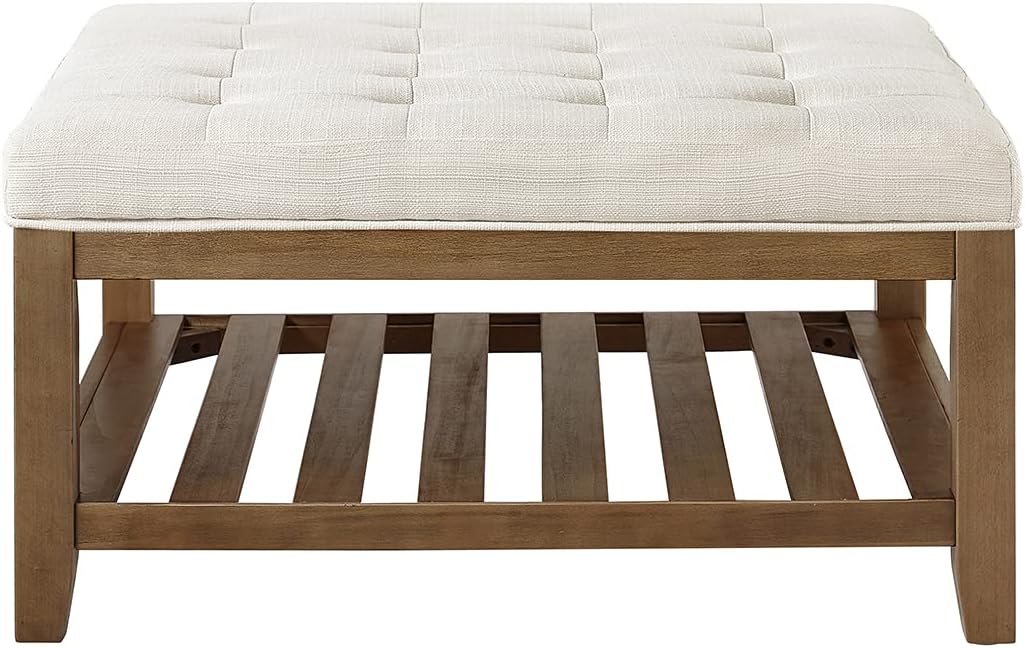 24KF Large Square Upholstered Tufted Linen Ottoman Coffee Table, Large Footrest Ottoman with Solid Wood Shelf-Ivory