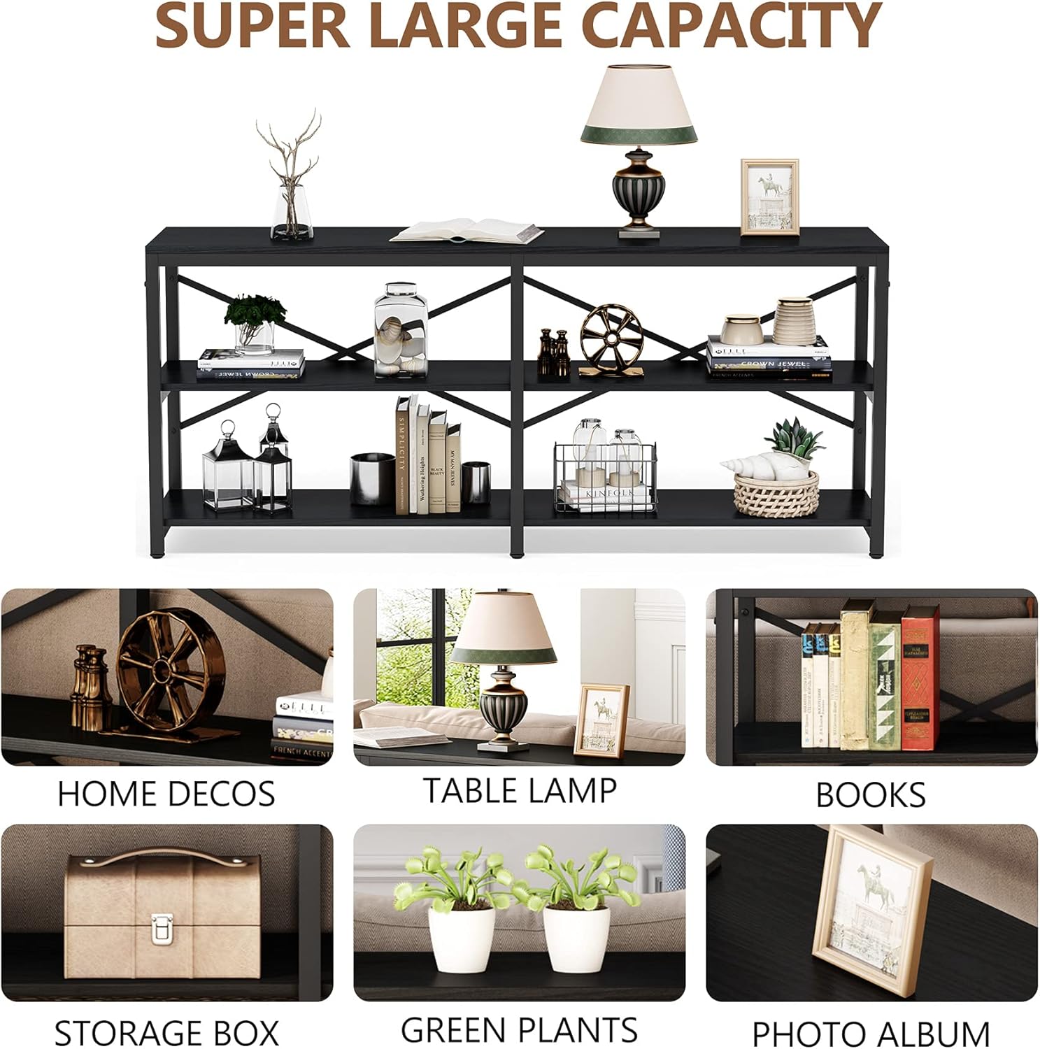 - ✔【LARGE STORAGE SPACE】:This console table featuring with three open shelves offers ample space for convenient storage and display, saving space and making your home tidy. It is long enough to stretch your couch and set down books,plants, frame photos, home decorations.