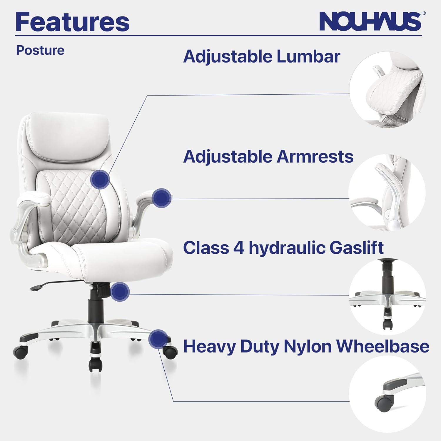 - Click-5 Comfort: The Nouhaus office chair comes with five-position adjustable lumbar support, offering personalized support and comfort. You can select the most suitable lumbar support position to help you maintain a comfortable and healthy posture during long hours of work.