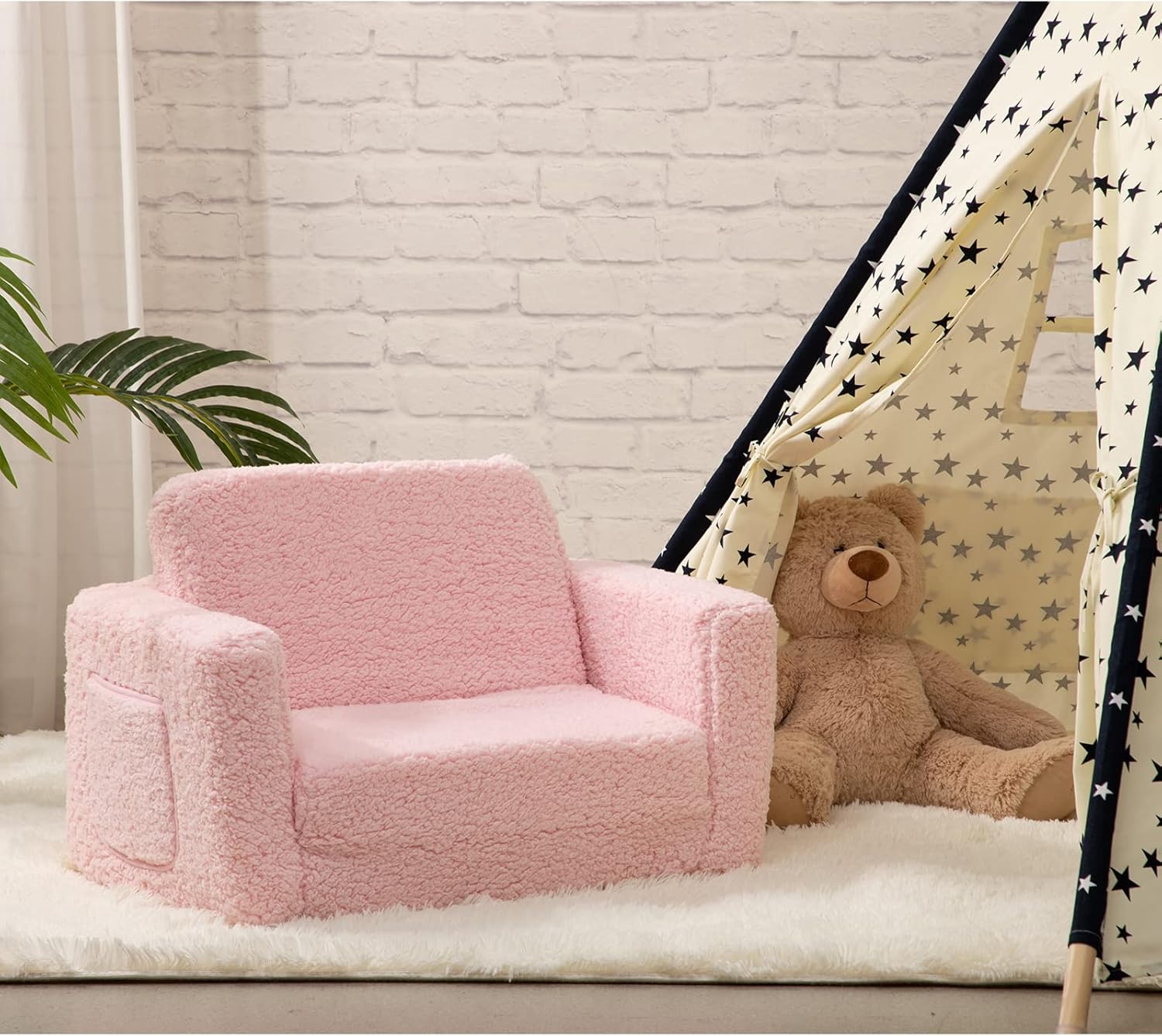 ALIMORDEN 2-in-1 Flip Out Cuddly Sherpa Toddler Couch Convertible Sofa to Lounger, Pink