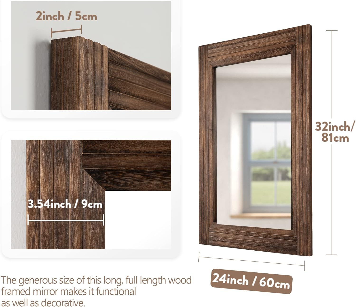 • Clear Images and Neutral Reflection-- Our mirrors are made from high transmission rate floating glass, super HD imaging, beautiful, natural and no distortion. Our wood frame mirrors are made to strict commercial standards.