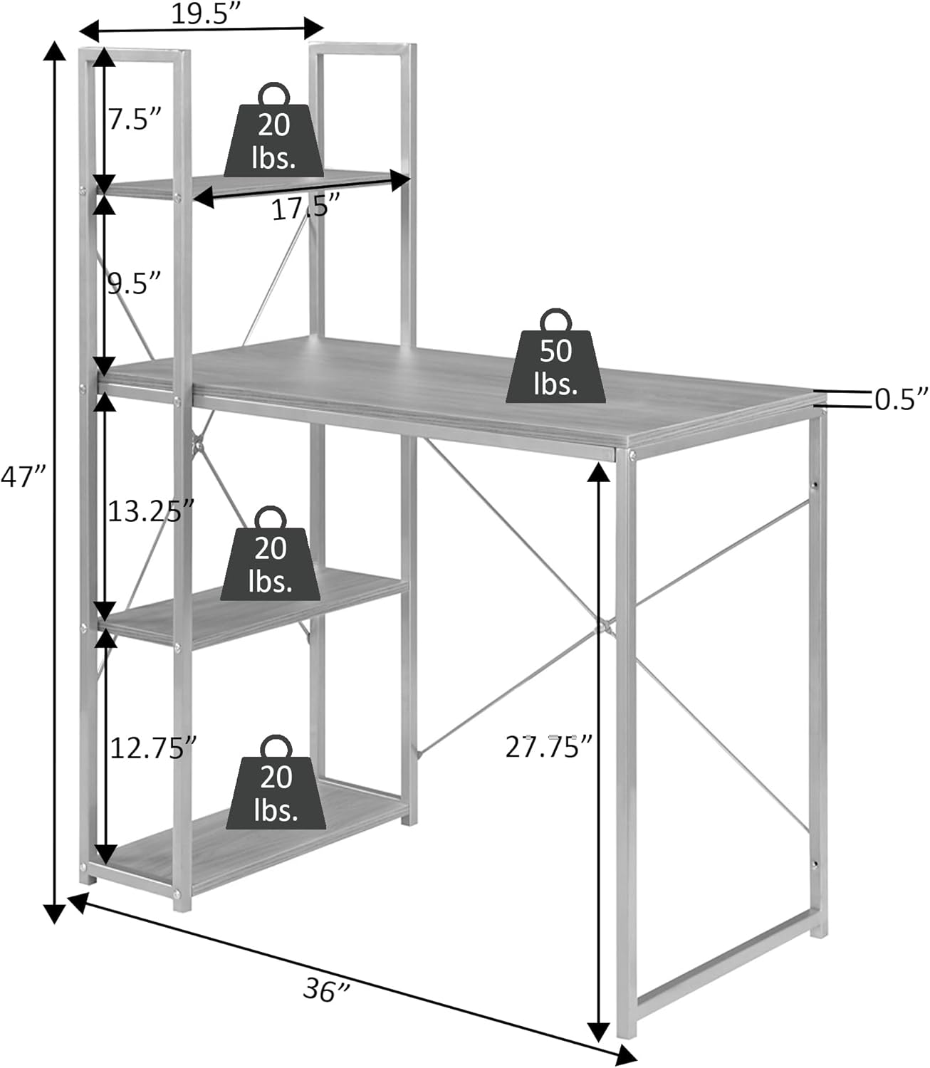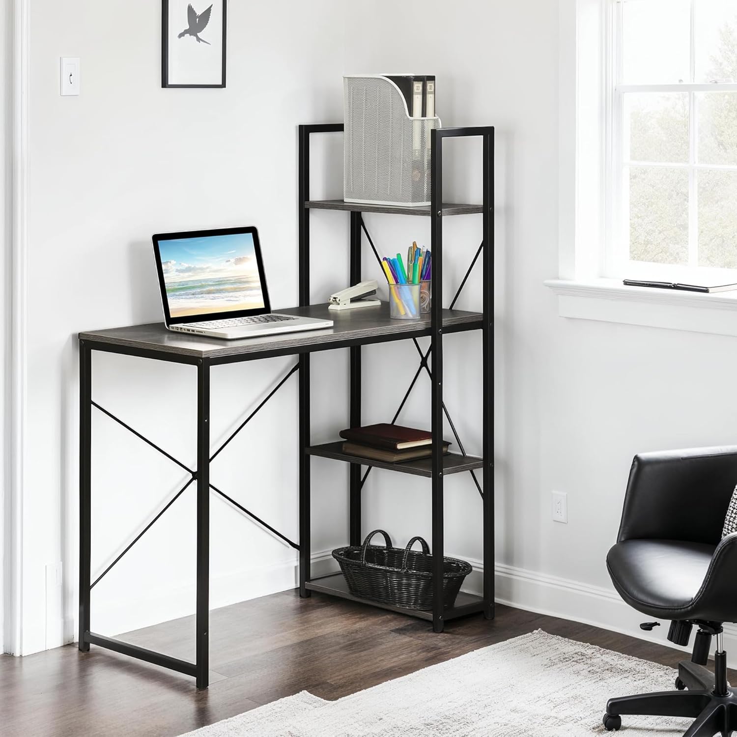 - SPACIOUS SHELVING: With a spacious desktop and multiple tiers of shelving, this piece offers ample storage and workspace for your books, computer, and other office essentials