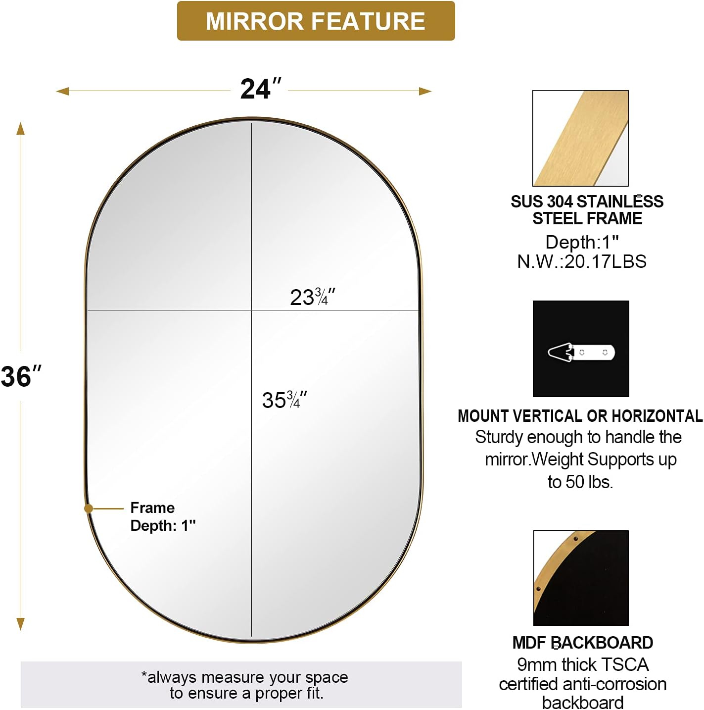 - Overall:24x36 inch, weighs 20.17 lbs, please always measure the space before your purchase. Thanks to the simple but silhouette capsule shape design, this pill shape mirror is idea for the limited space but you desire for the large mirror for bathroom, bedroom, power room, entryway, hallway, sunny room,guest room. Let this large oval wall mirror be the part of your decoration and it would enhance the beauty of your space.