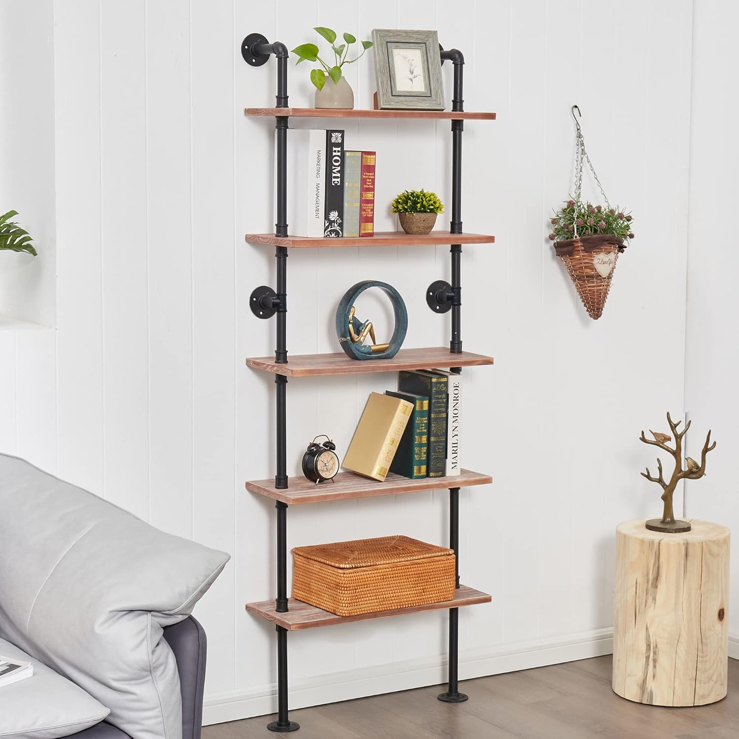 5 Tier Industrial Ladder Bookshelf, Wall Mounted Wood Metal Rustic Pipe Shelves (Weathered Brown, 5 Tier - 10" D x 24" W x 70" H)