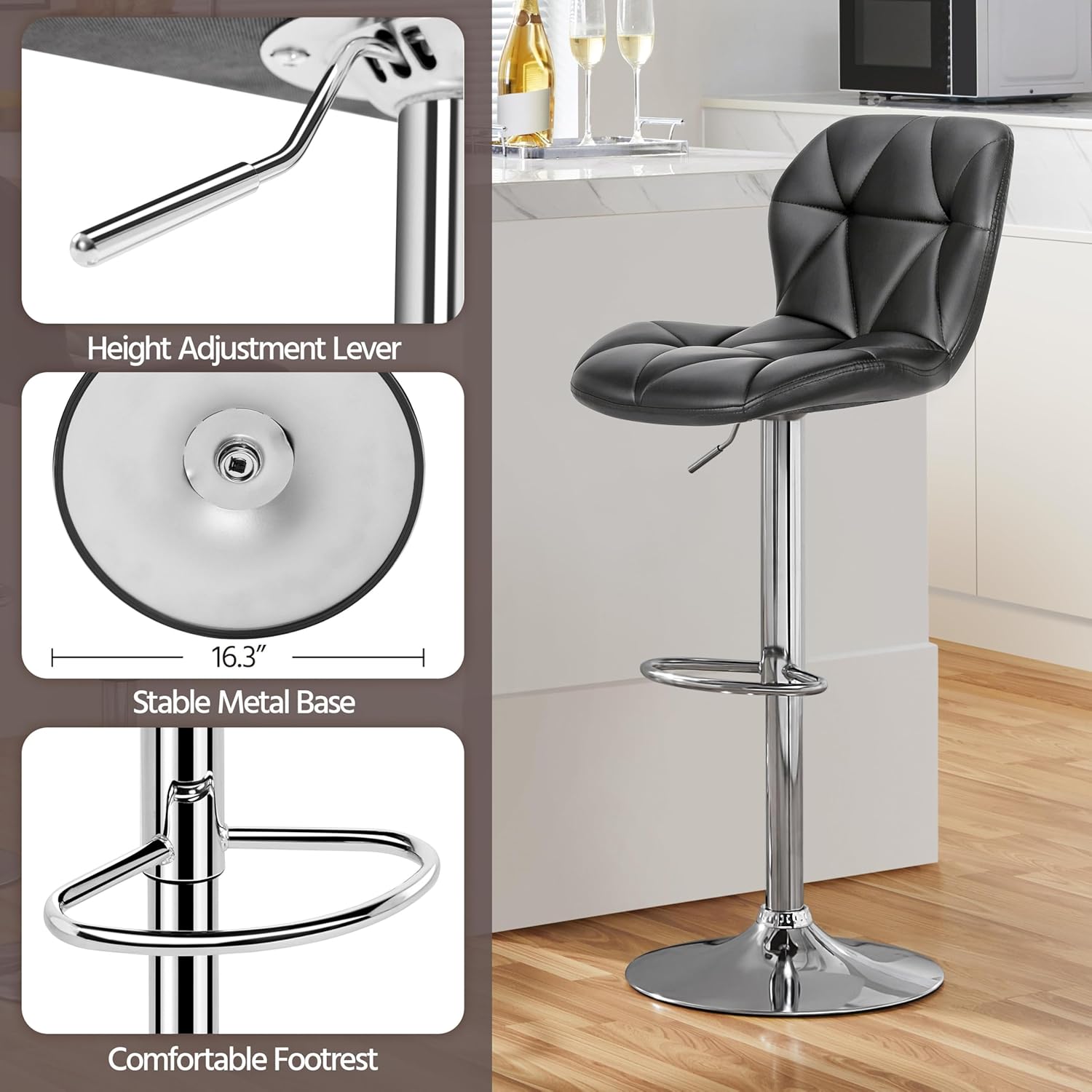 - Classic PU Leather Finish: This kitchen counter stool painstakingly select smooth PU leather and galvanized steel legs for a luxurious but sleek look. The triangle tufting on the seat and back creates a stylish cushioned look.
