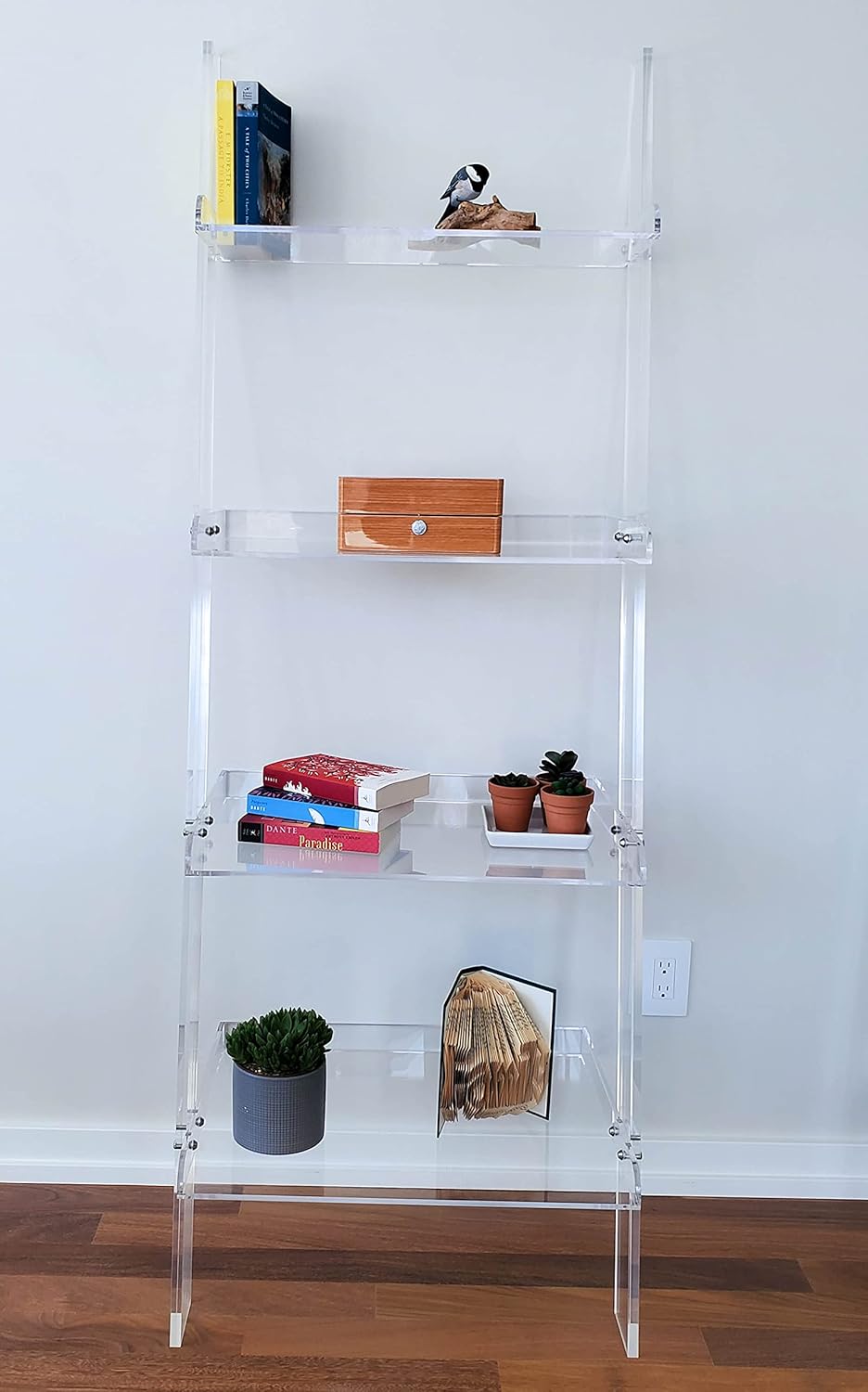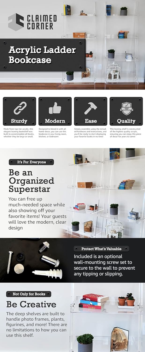 - MODERN DESIGN: The Claimed Corner clear acrylic ladder stand is a standout non-wood option that will beautify and expand interior storage space for your living room, home office, study, or bedroom. No need for metal, oak, or rustic alternatives.