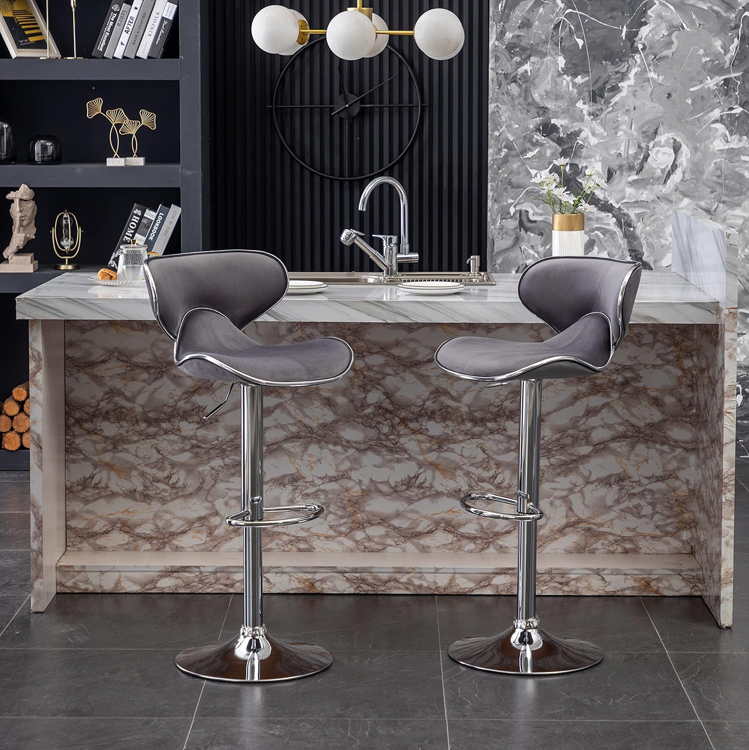 - Set includes two barstools. This stool features a sturdy chromed metal base with a built-in 360 swivel function and footrest