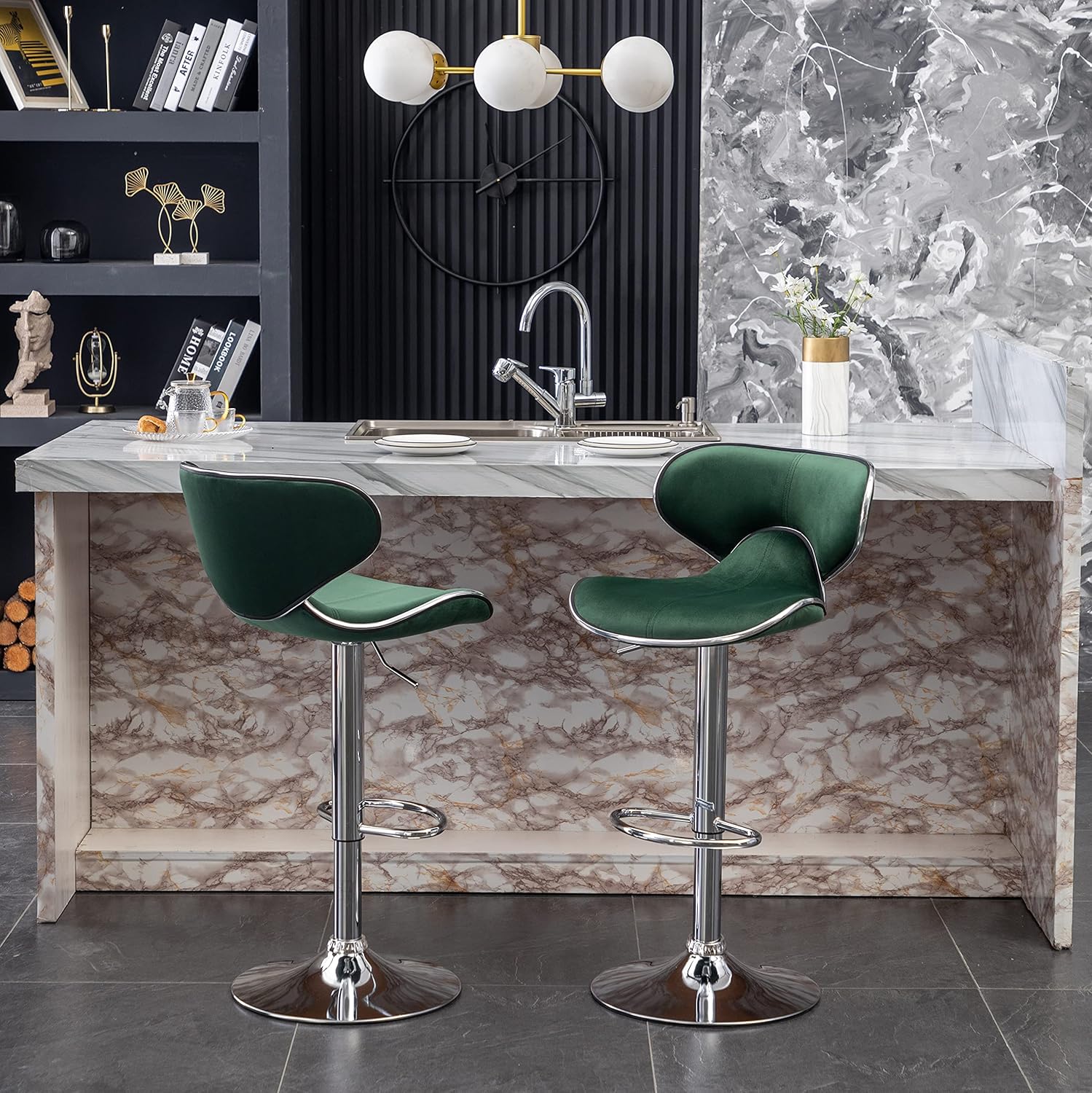 - Set includes two barstools. This stool features a sturdy chromed metal base with a built-in 360 swivel function and footrest