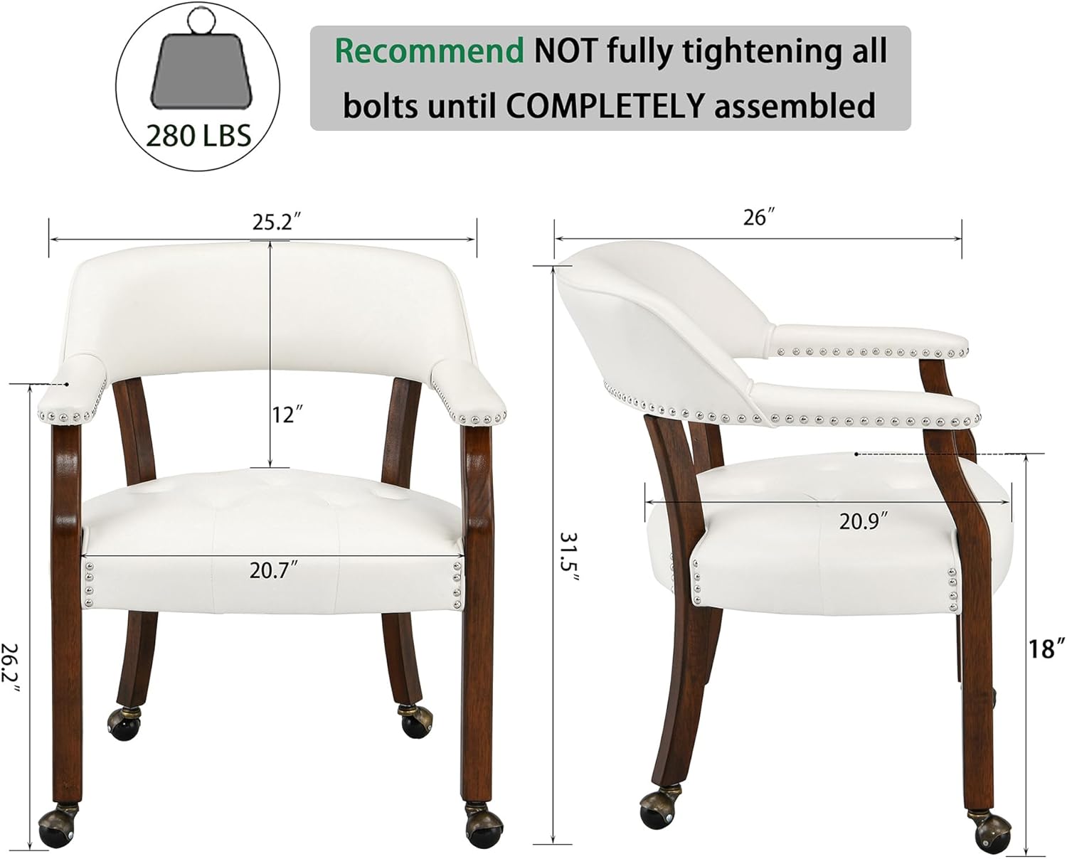 - Easy To Set Up: It will be a breeze to assemble the pre-assembled dining chair with casters if you can follow full assembly instructions and the assemble video step by step. Please ensure that 2 front legs are on the correct sides before installation. Don't tighten any of the bolts much at all (80% is enough) until join all the parts. Relatively easy to assemble with a household electric drill and 2 people if available.