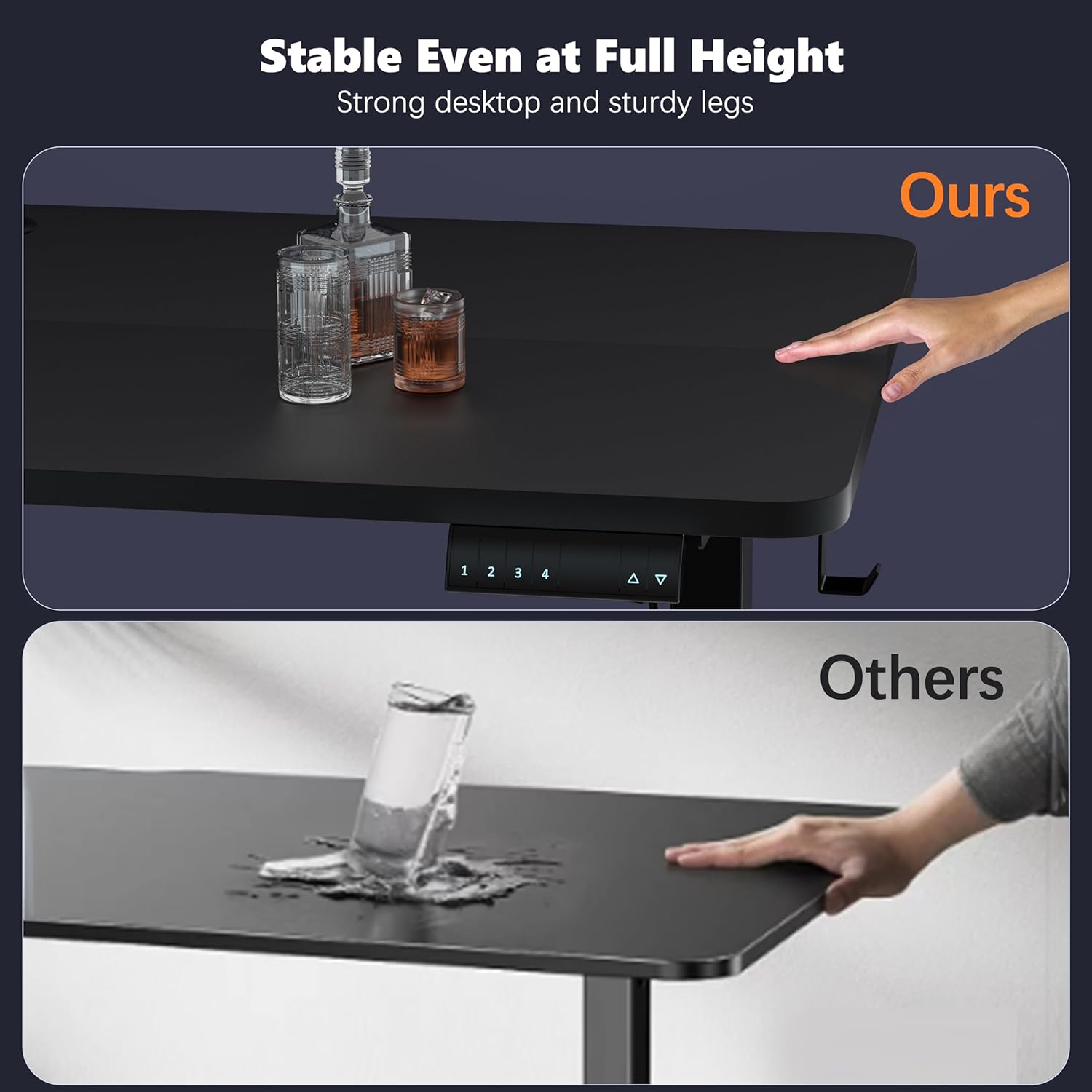 - 【Memory Height Sit Stand Desk】-- The digital display allows you to preset 3 heights, meet different height of your family mumbers. Encounters obstacles when lifting, the stand up desk will move in the opposite to avoid damage your family and your pets.