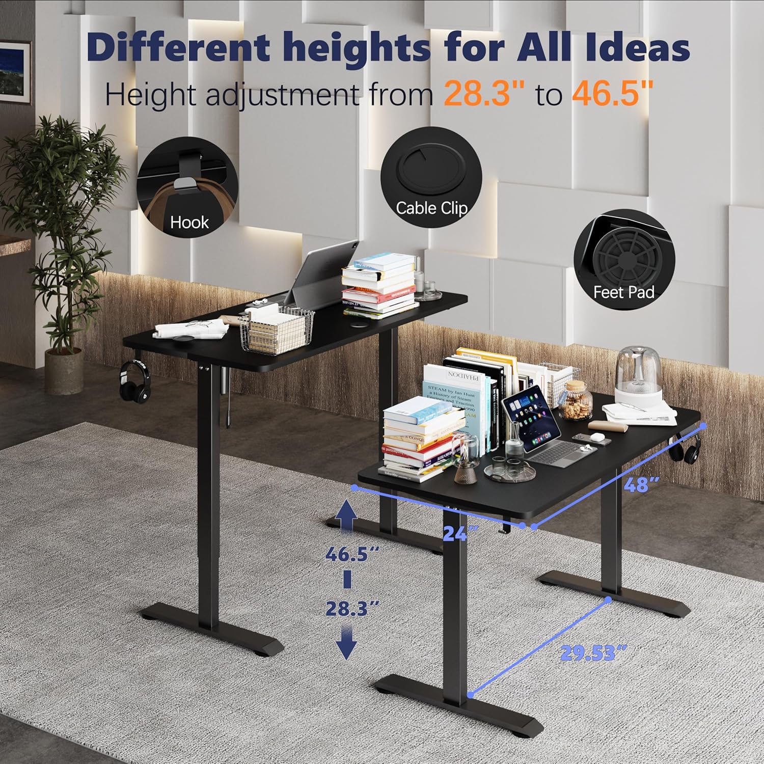 - 【Spacious an Safe Workspace】--This adjustable desk with 48” x 24” eco-friendly desktop provides you with a spacious workspace. Safe and Low-VOC Materials,insert healthy movement into your day.