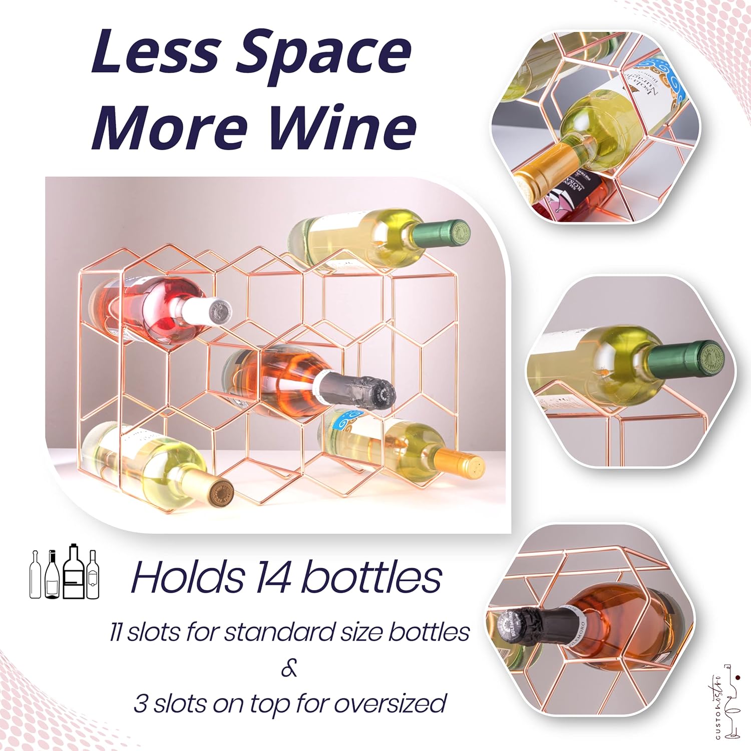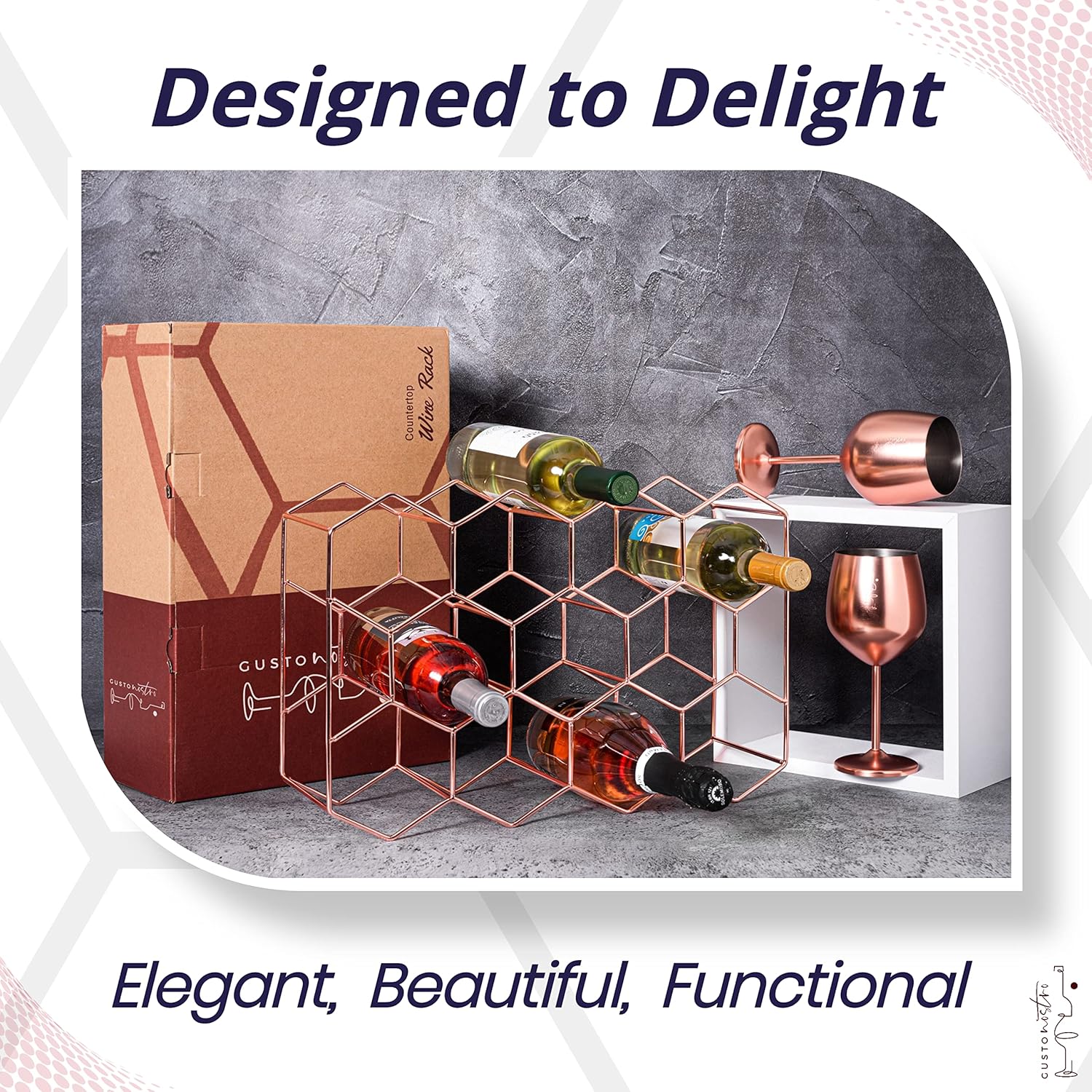 - SHOW OFF YOUR TASTE in wine (and beautiful home decor) with Gusto Nostro’s exquisite rose gold wine rack. The chic countertop wine rack made to delight