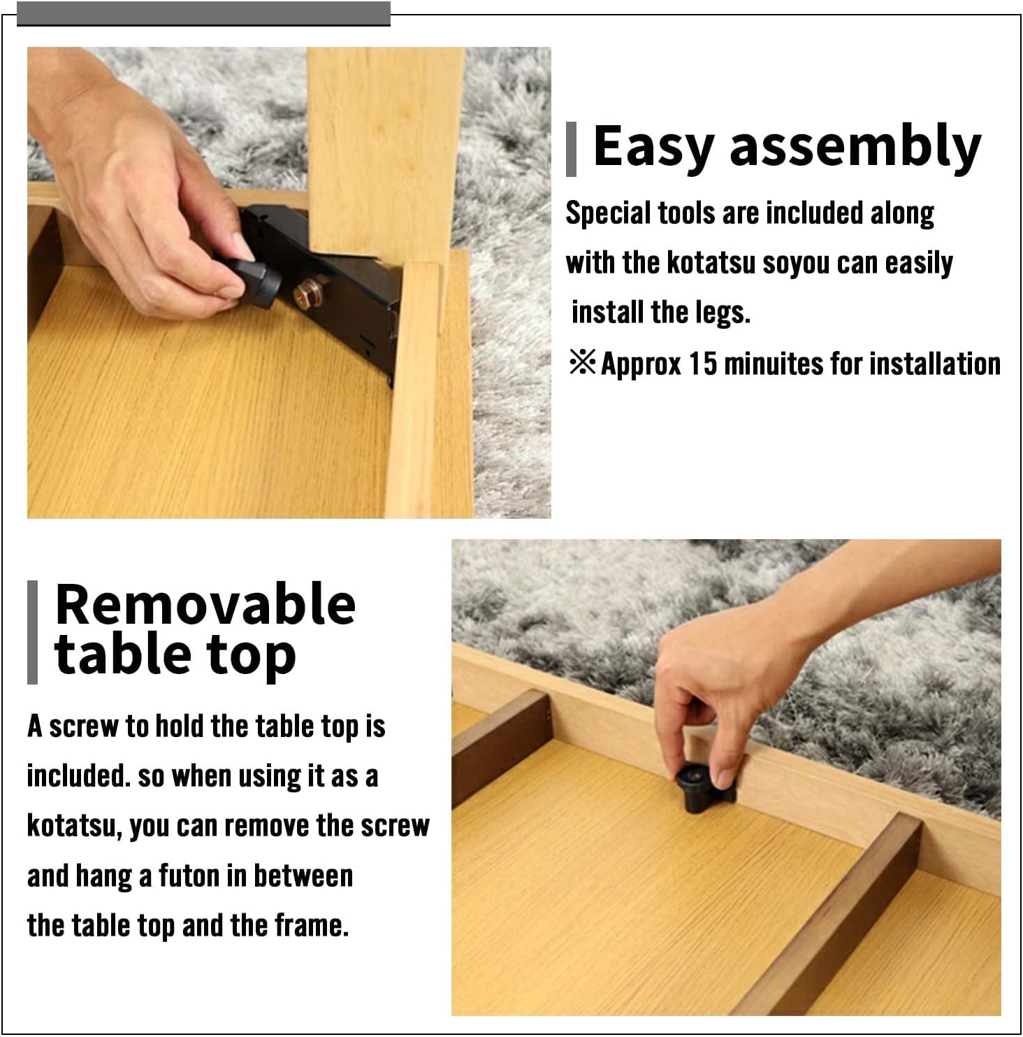 - Easy assembly, reliable design Assembly is easy with bare hands and no tools required. It is also possible to put kotatsu futon or a queen size blanket between the table leg and the table top board. Reliable design that protects the heating element with a power fuse and resin that does not melt, reducing the risk of fire.