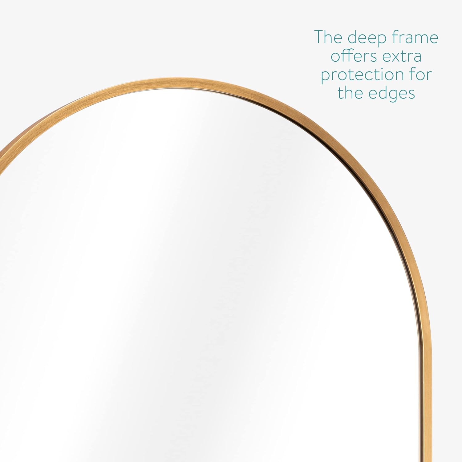 - ARCHED FRAME: The mirror's arch-top metal frame has a chic golden finish, providing an elegant surround for your reflection. Make a style statement instead of settling for a standard shape like a square, rectangular, round or oval mirror.