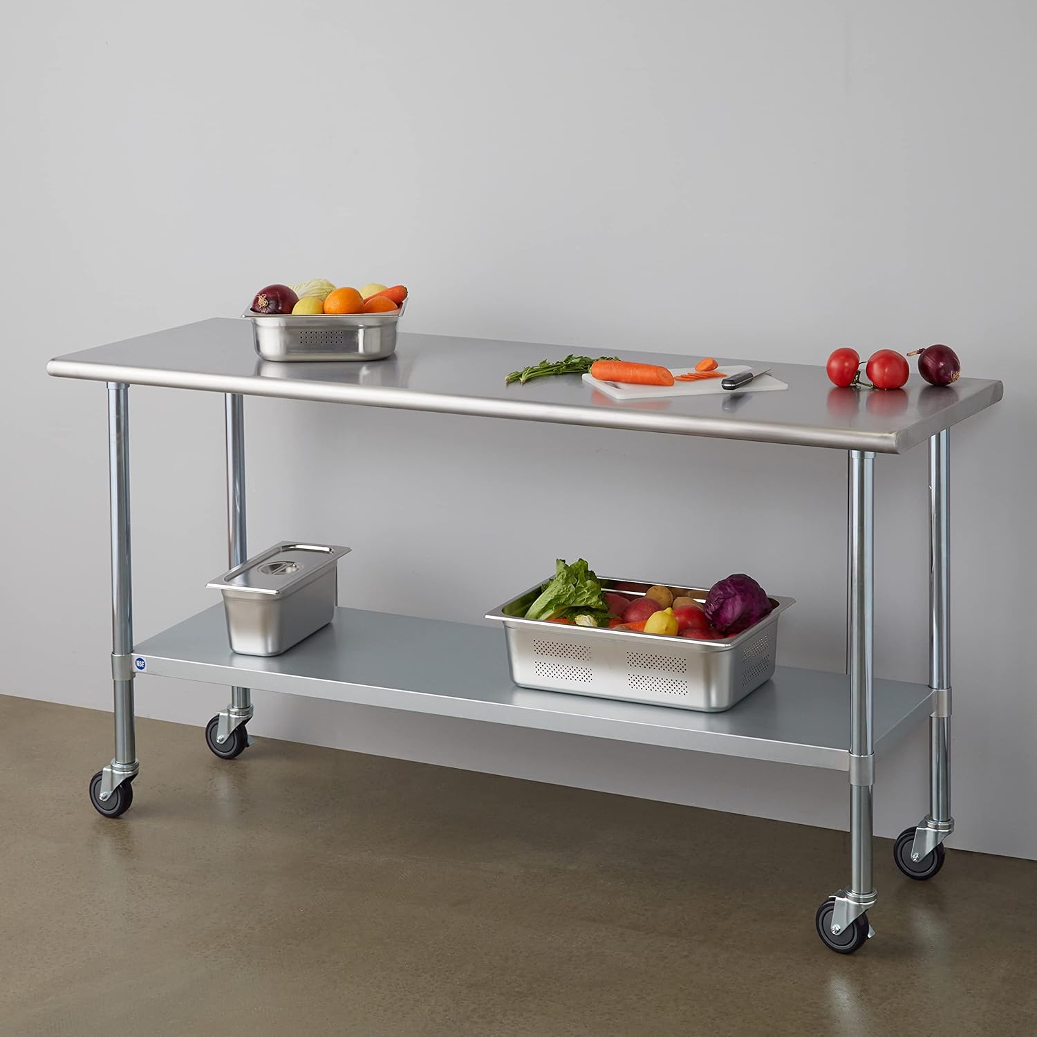 - Enduring Quality and Safe Material- NSF certification offers you better health protection. The top shelf is made of 18-gauge #430 stainless steel;galvanized legs and adjustable undershelf.Surface drawing treatment, offering excellent corrosion resistance, durability, ease of cleaning.