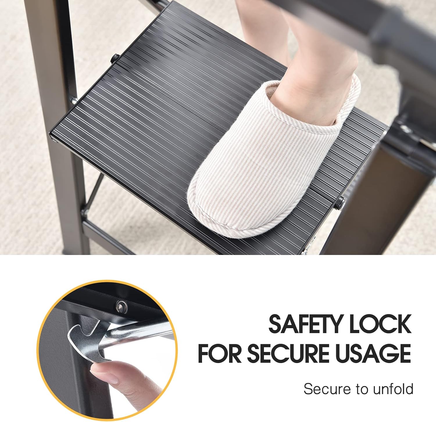 - Stability first: Kingrack has been designed functionally and safely for the needs of a modern household. The feet are equipped with rubber caps, thus protect your floor from scratches. Steps with anti-slip ribbing for optimal standing. When fully opened, the safety hook automatically locks into place and prevents unwanted folding.