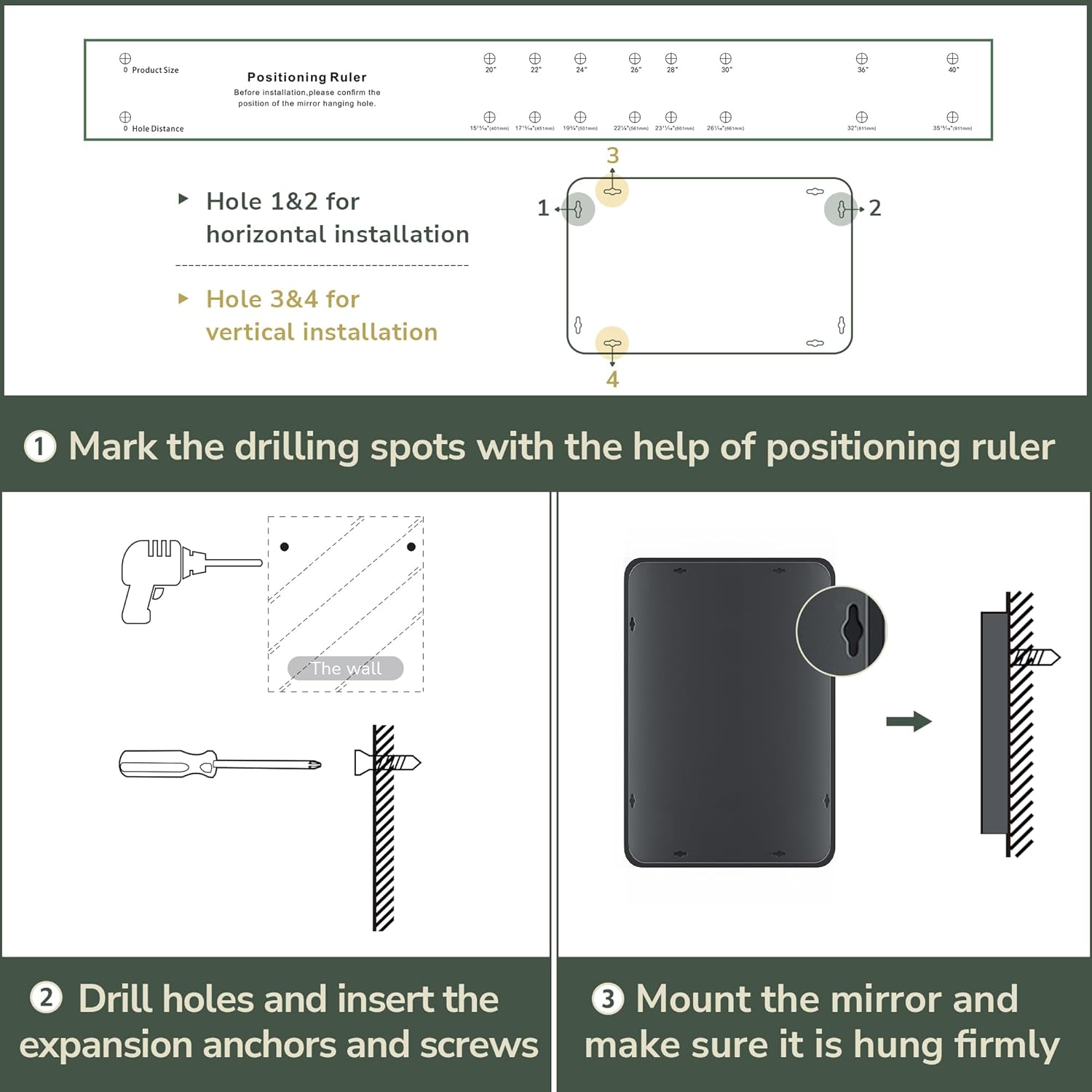 - ❥Easy To Install :This lightweight mirror comes with more reinforced "+" holes on the back, wall hardware and screws that can be hung horizontally or vertically.Just drive the screws into the wall and chose two holes to hang the mirror on the screws to complete installation.