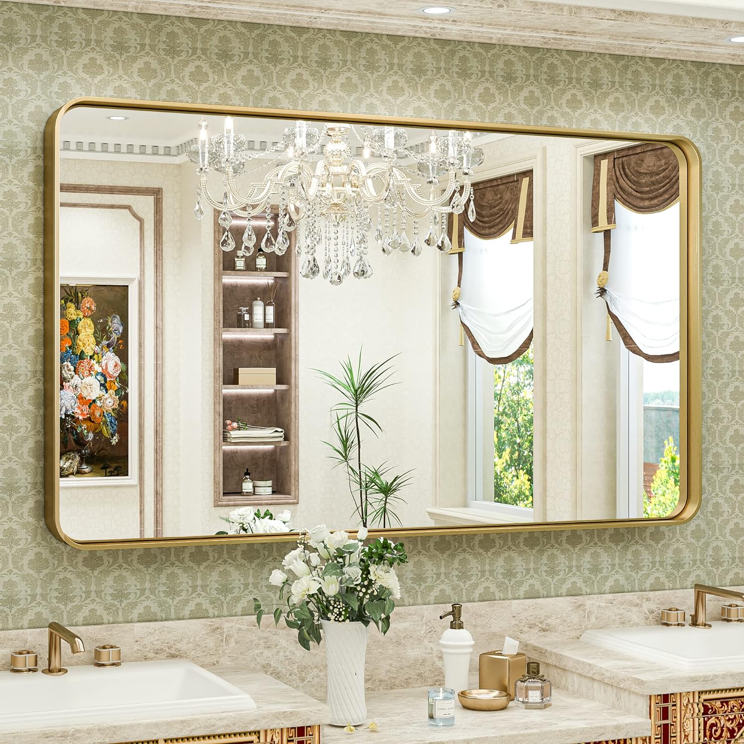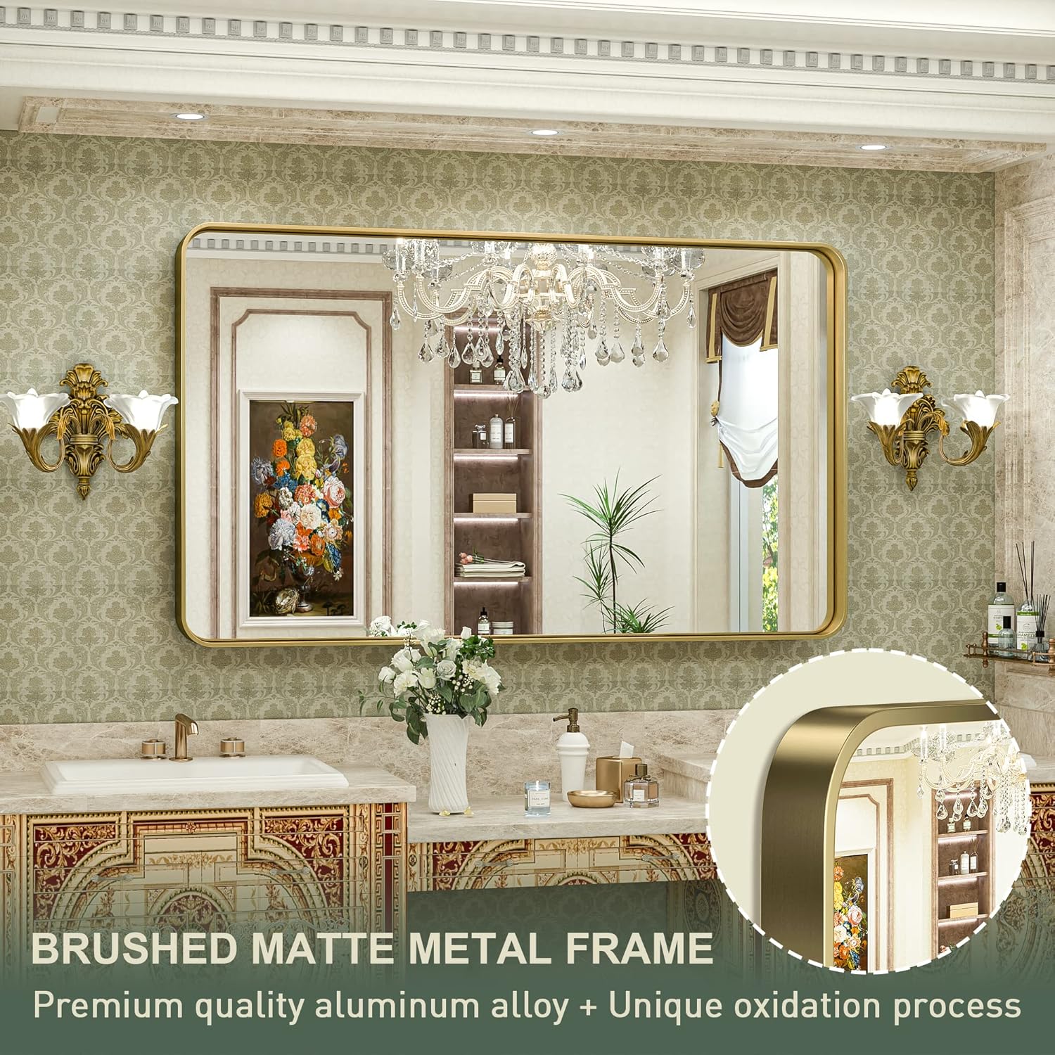 TokeShimi Gold Bathroom Mirror for Wall 48 x 30 Inch Metal Rounded Corner Rectangle Mirror Wall Mirror in Aluminum Alloy Metal Frame Deep Set Design Hangs Horizontal Or Vertical