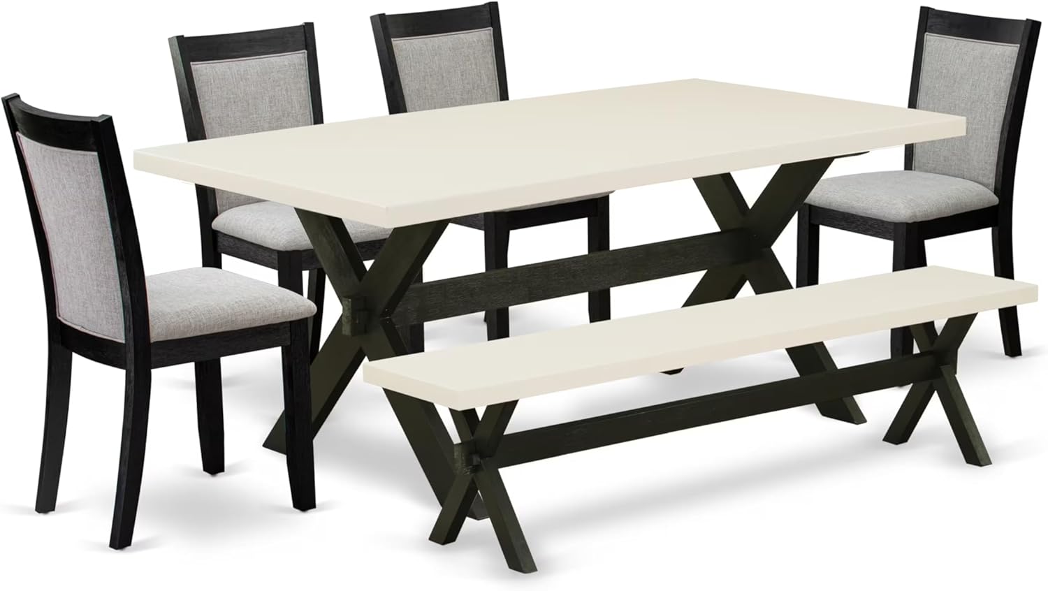 East West Furniture X627MZ606-6 6 Piece Dining Table Set Contains a Rectangle Dining Room Table with X-Legs and 4 Shitake Linen Fabric Parson Chairs with a Bench, 40x72 Inch, Multi-Color