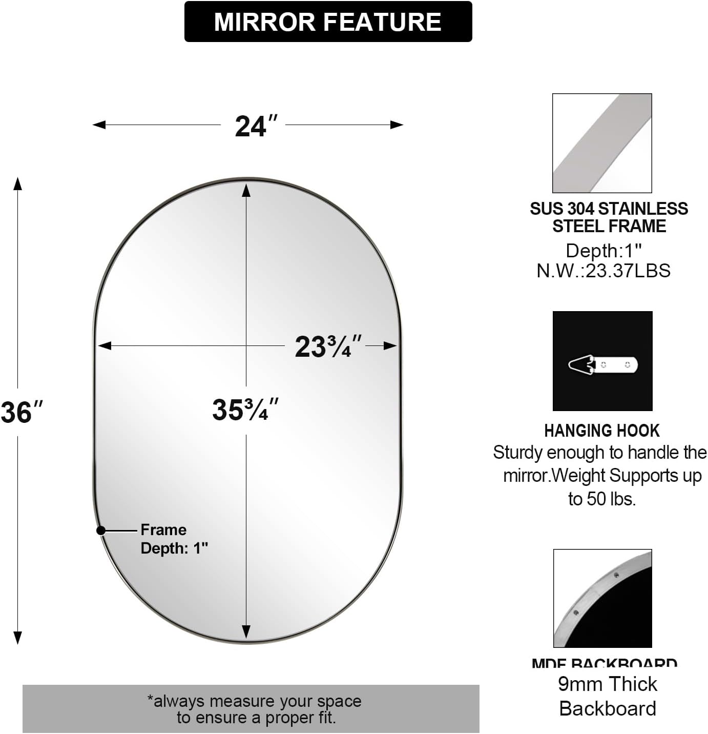 - Excellent Performance: A sleek, modern stainless steel metal frame surrounds a unique pill-shaped mirror; sets it apart from traditional rectangular or oval mirrors; polished chrome finish complements your bathroom; adds light and space to the room