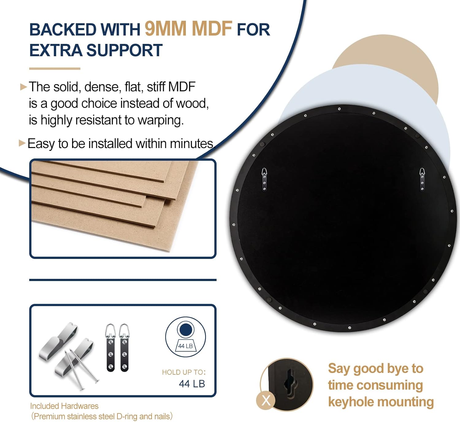 - Safe & Easy to Install: Our round wall mirror is easy to install with pre-installed D-ring clips; If any missing hardware, just contact us and we will send out the new one asap; For heavy vanity mirrors, 2 people are recommended when installing the mirror
