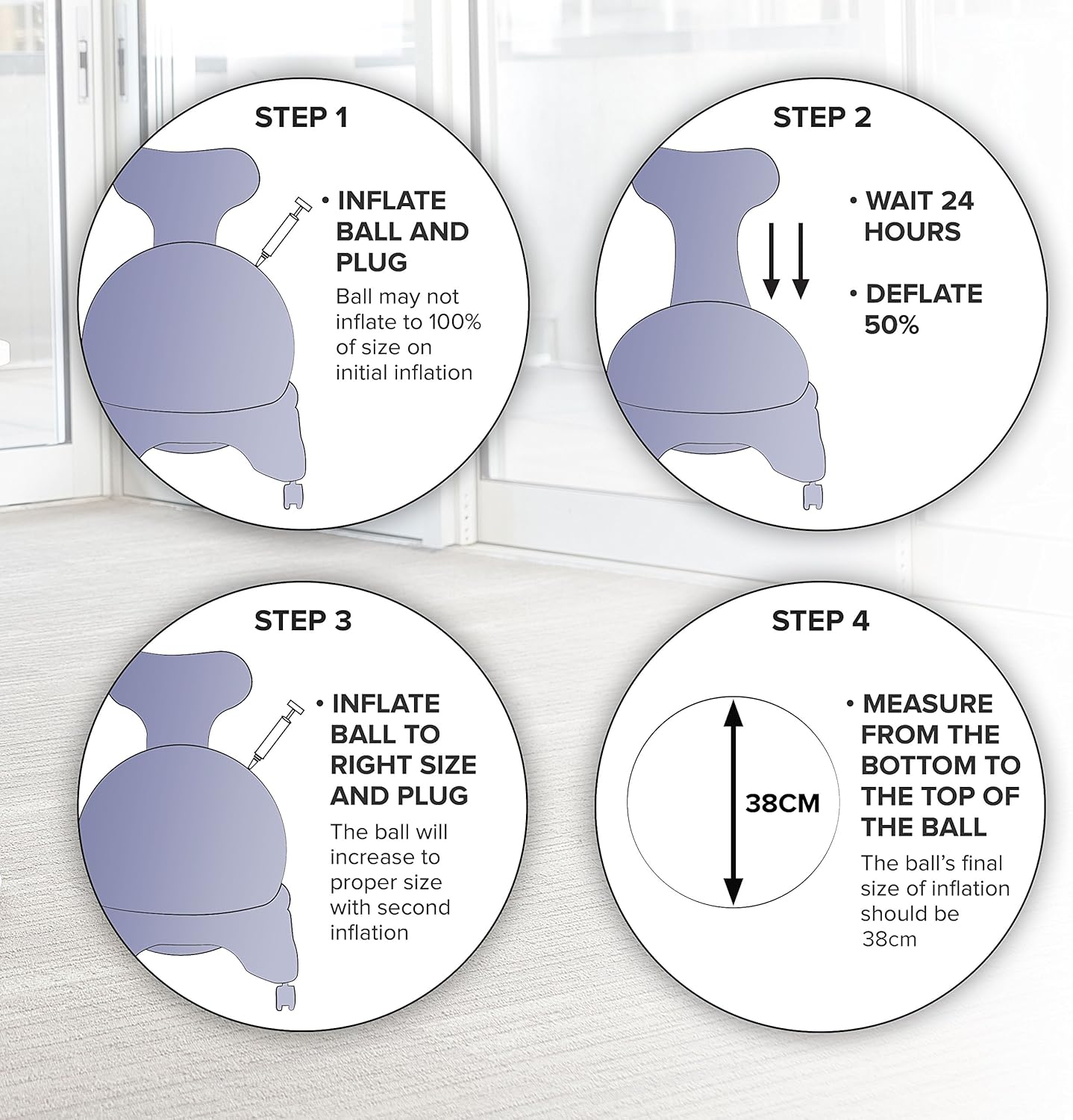 - INFLATION INSTRUCTIONS: For a perfect fit, it may be necessary to re-inflate the ball once or twice after the initial inflation to stretch to its final size. Inflate ball with air, let stand for 24 hours, deflate 50% then fill again to 38cm height.