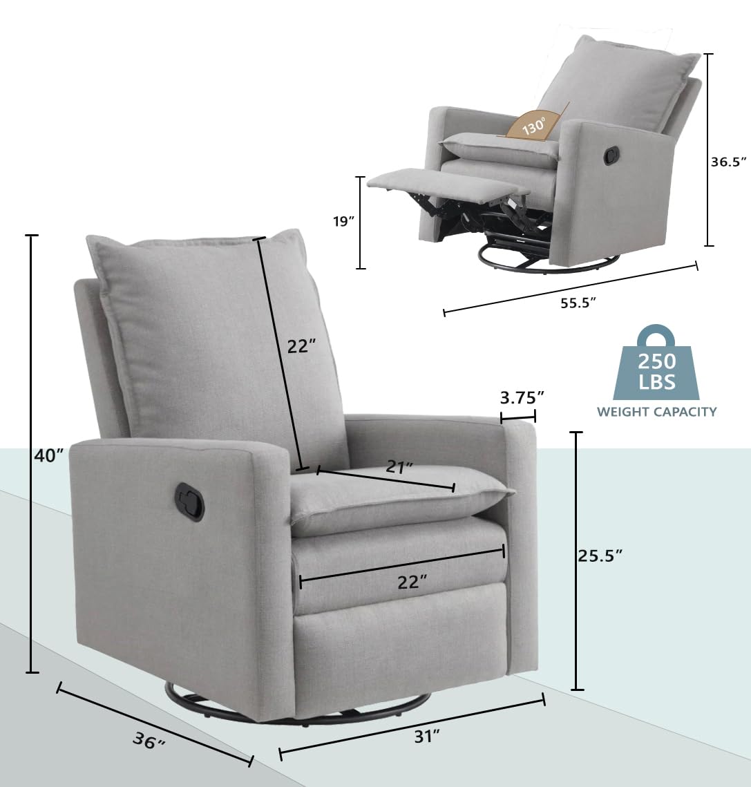 - GENDER NEUTRAL FOR EVERY ROOM: This glider recliner comes in a beautiful gender neutral tone Gray. It's light neutral tone blends well and adapts beautifully into any room environment.