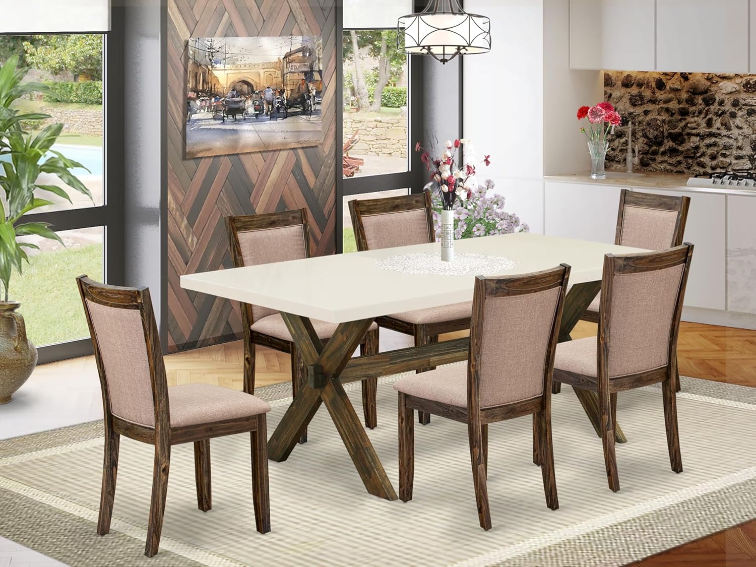 East West Furniture X727MZ716-7 7 Piece Kitchen Table Set Consist of a Rectangle Dining Table with X-Legs and 6 Dark Khaki Linen Fabric Parson Dining Chairs, 40x72 Inch, Multi-Color