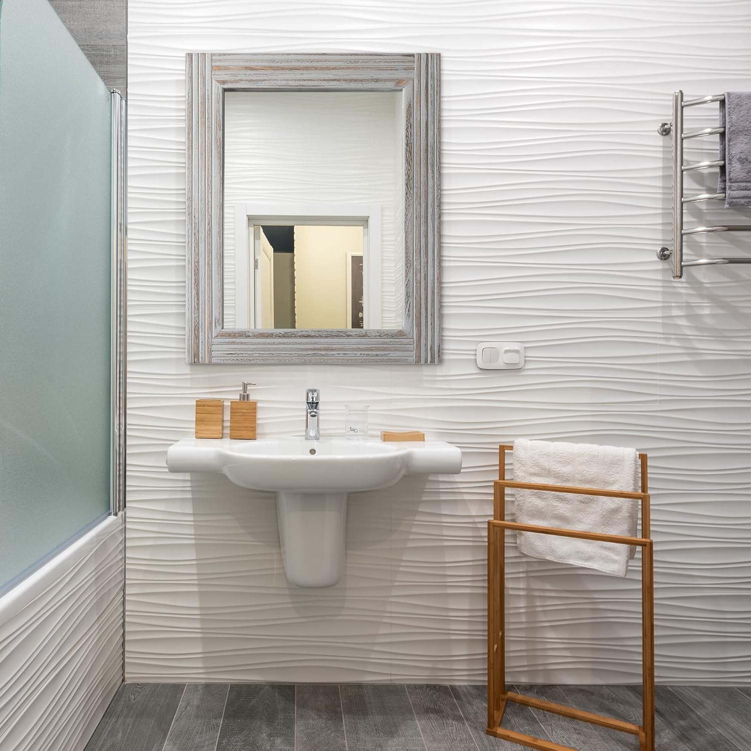 - Quality Craftsmanship-- Mirror: This mirror is constructed of authentic 5mm silver backed glass which is explosion-proof and scatter prevention. Backplane: The backplane provides a double layer of protection. Premium MDF backing is well protected against moisture, perfect for bathroom.