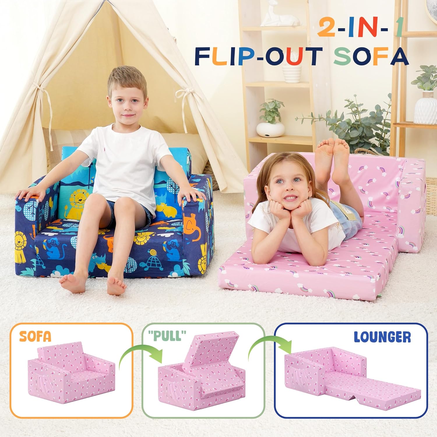 - 2 IN 1 - Perfectly sized sofa bed for kids. Fold-out bottom piece 2 in 1 Flip Open Kids sofa bed, gives childrens the option of lying down flat. Give children to read, play, or folded into a reclining chair and take a nap to provide a more comfortable place.