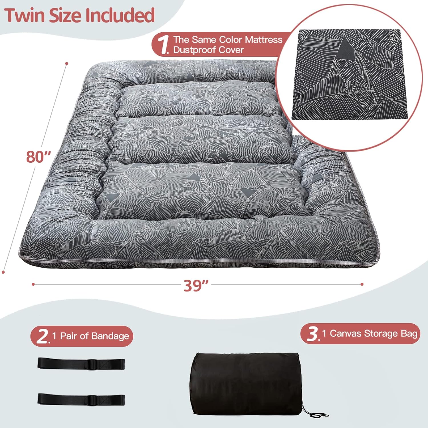 - WIDE VERSATILITY: It can be used as Camping Mattress/Bedroom Futon/Living Room Futon/Tatami Mat/Floor Mattress/Sleeping Floor mat/Tent Mat/Guest Mattress/Japanese Bed Mat, also can be kids play mat/floor pillow bed, also bring it with you in your car when going to anywhere, it is a good accompany for your family, Just Enjoy Your Leisure Time with MAXYOYO Japanese Floor Futon Mattress