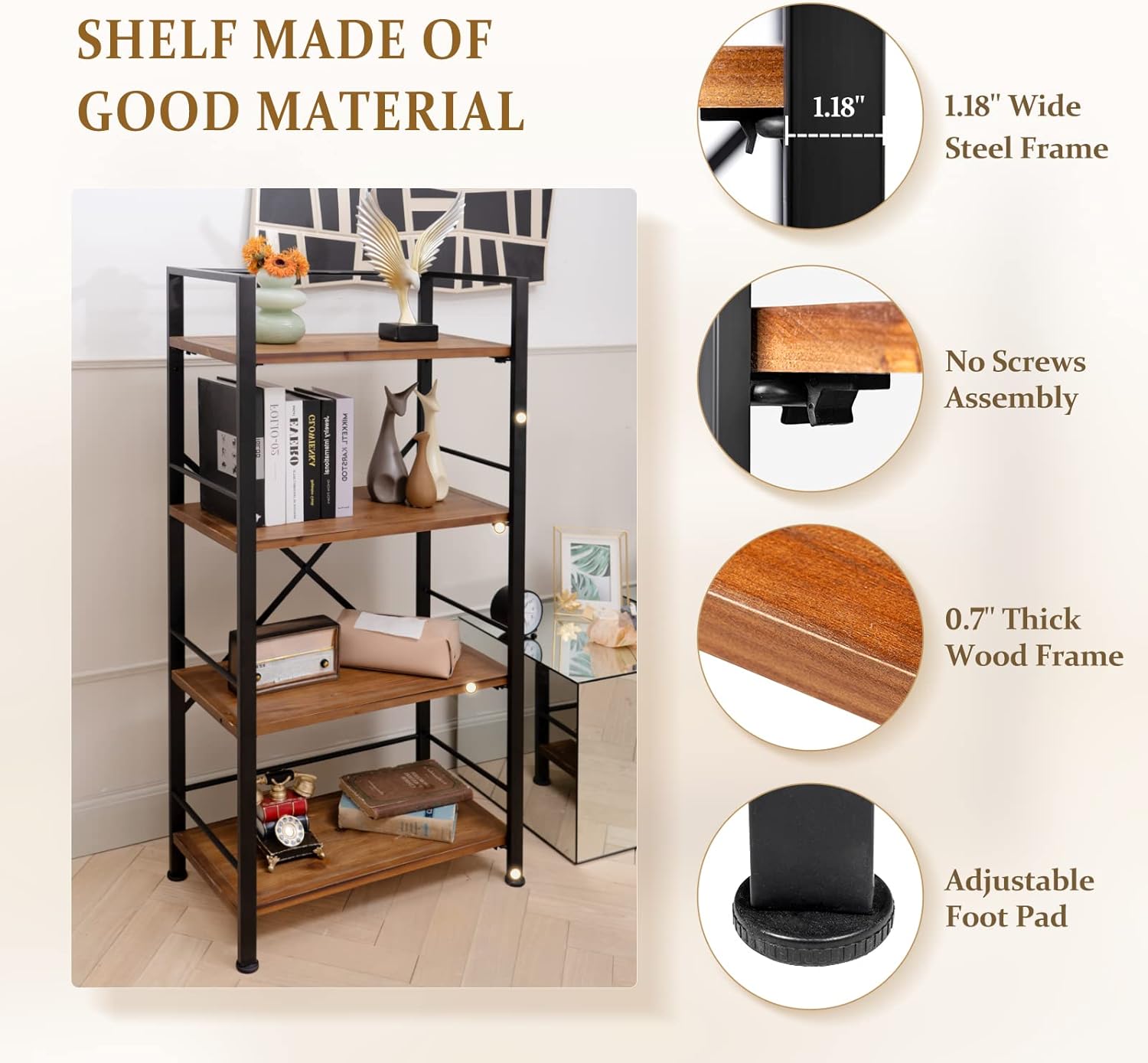 Crofy Rustic Bookshelf, 4 Tier Real Wood Bookshelf, Metal Book Shelf for Storage, Black Bookcase, 12.6" D x 23.62" W x 50.39" H