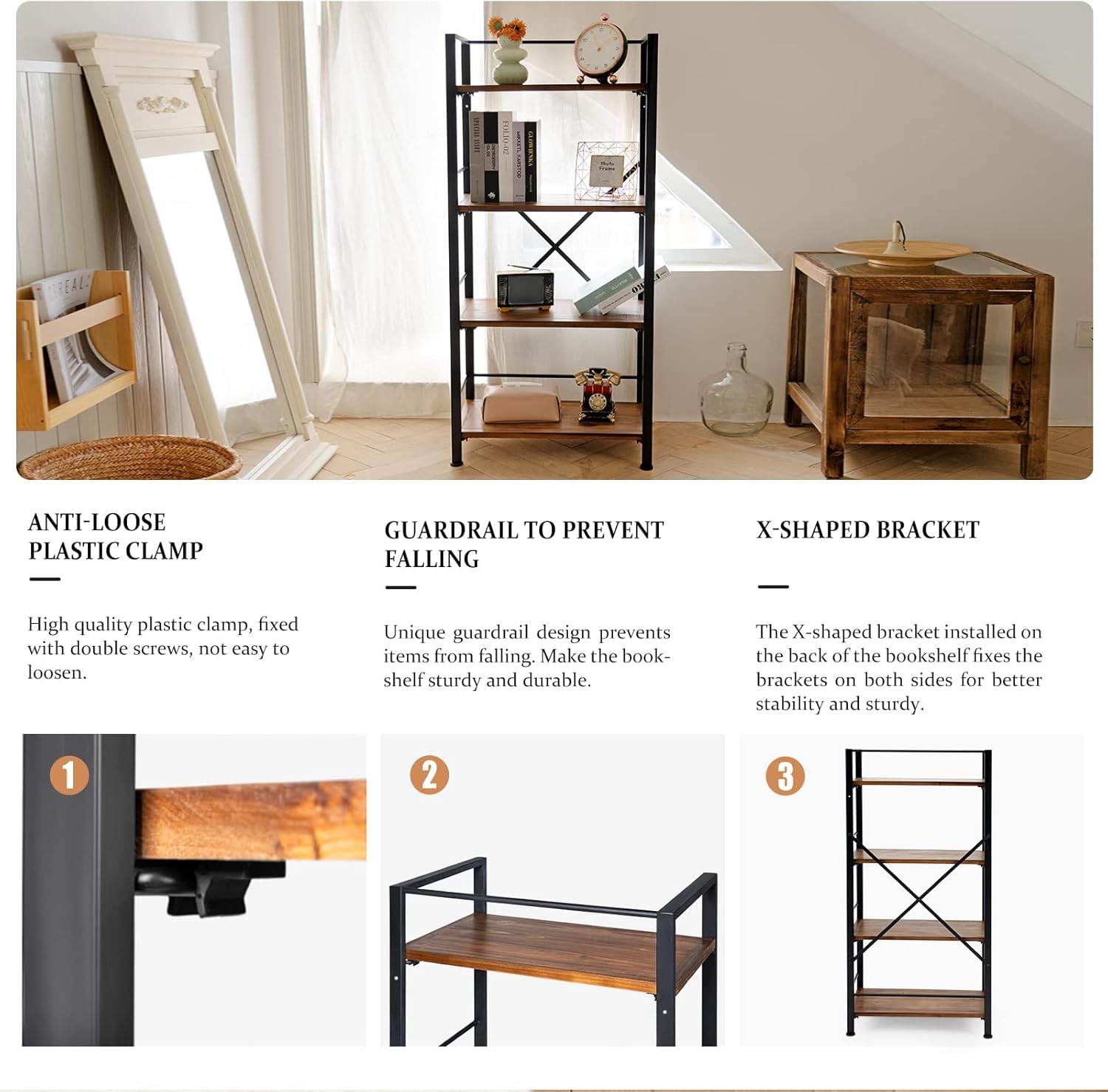 - 【Sturdy Construction】High quality metal tube frame make the bookshelf super sturdy. The X-shaped bracket and adjustable leg pad will strengthen the stability and keep balance. There are guardrails on each shelf to prevent things from falling.