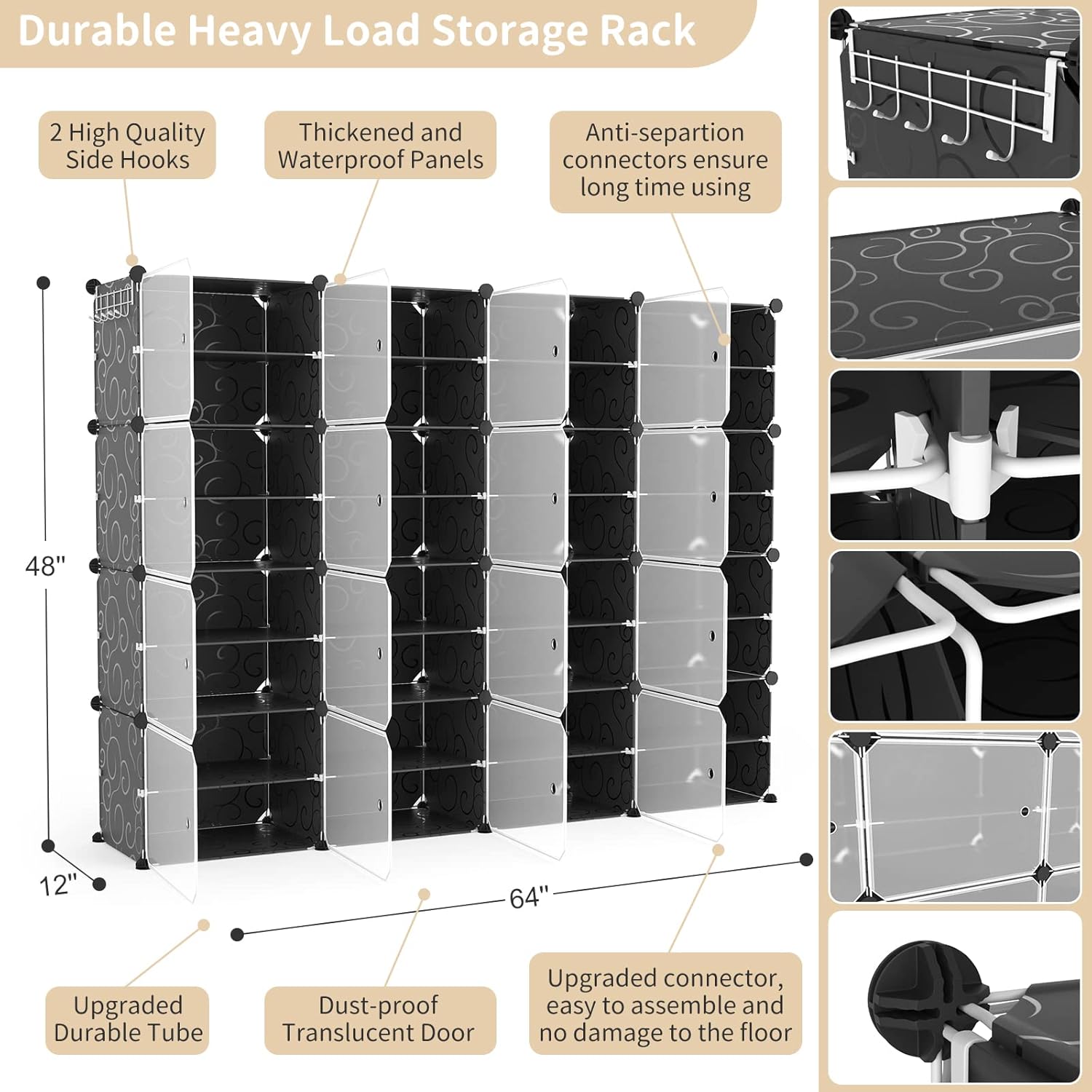 - 【CREATIVE DESIGN】Each cube supports up to 22 lbs. Each cube of the closet shoe rack storage organizer can hold up to 4 pairs of adult shoes, and the waterproof PP plastic panels are very durable to meet your long-term storage needs. The shoe cabinet with covers will be suitable for your cubby walk-in closet, entryway or garage, and the shoe shelf with layer height for boots regular heels, sneakers.