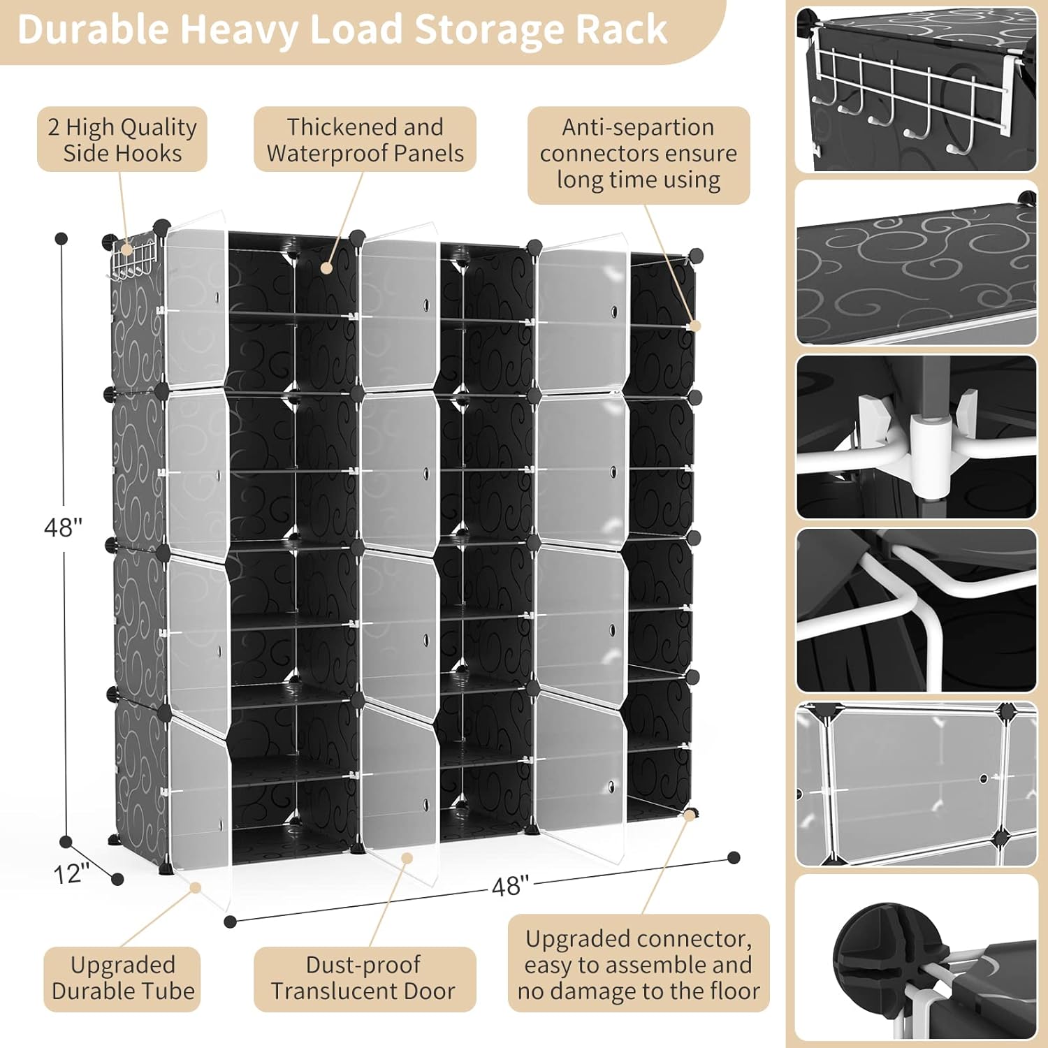 - 【CREATIVE DESIGN】Each cube supports up to 22 lbs. Each cube of the closet shoe rack storage organizer can hold up to 4 pairs of adult shoes, and the waterproof PP plastic panels are very durable to meet your long-term storage needs. The shoe cabinet with covers will be suitable for your cubby walk-in closet, entryway or garage, and the shoe shelf with layer height for boots regular heels, sneakers.