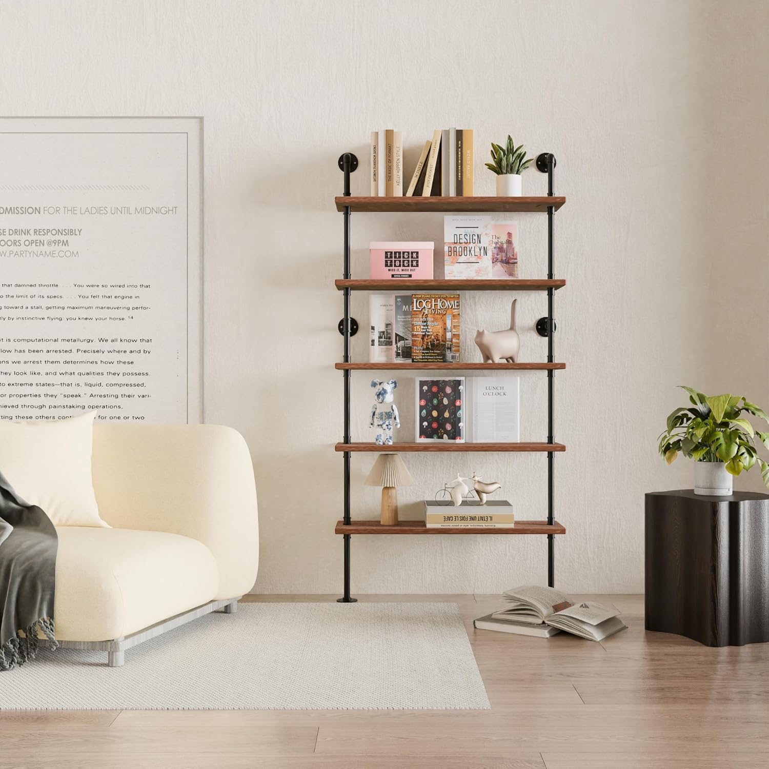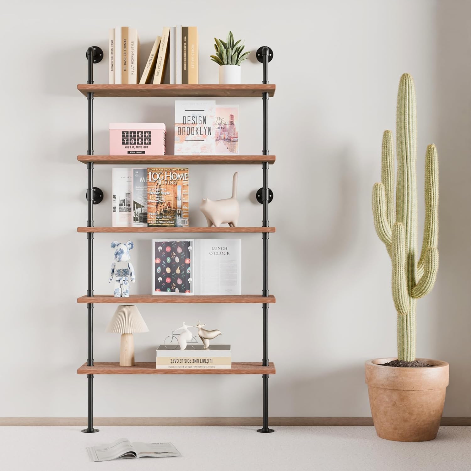 5 Tier Industrial Ladder Shelf Bookcase, Wall Mounted Wood Metal Pipe Rustic Bookshelf for Living Room (Weathered Brown, 10" D x 36" W x 70" H)