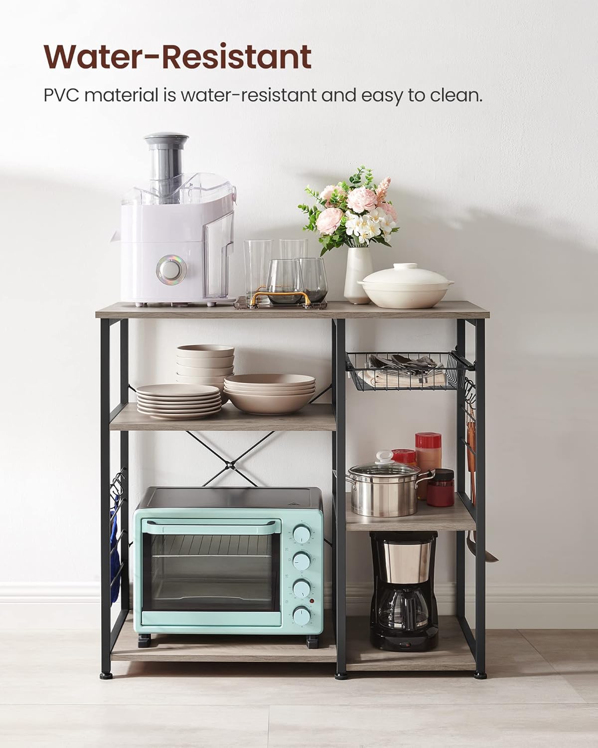 VASAGLE ALINRU Kitchen Baker’s Rack, Coffee Bar, Microwave Oven Stand, with Steel Frame, Wire Basket, 6 Hooks, for Mini Oven, Spices Utensils, Industrial, Greige and Black UKKS090B02