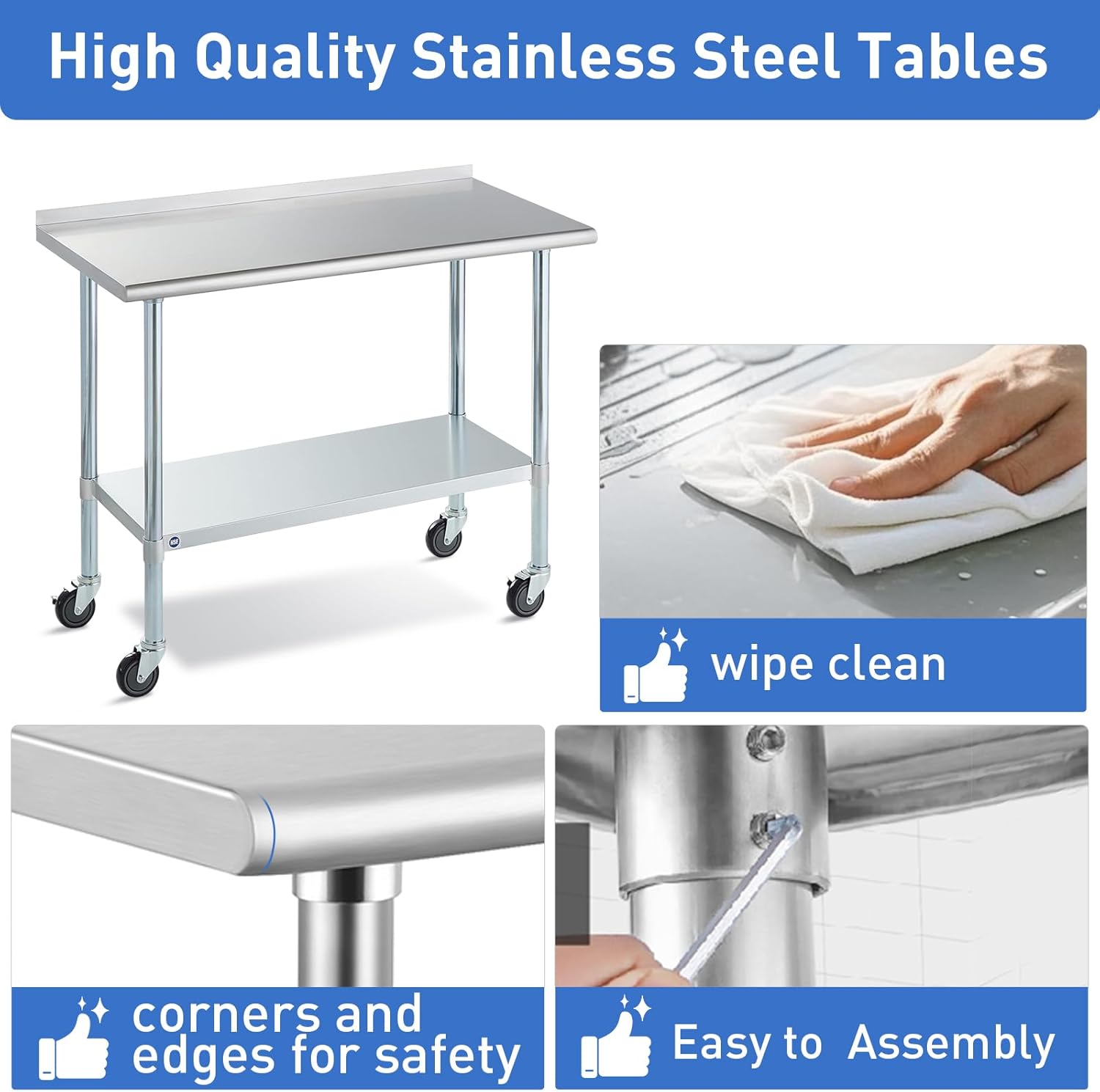 - Mobility and Stability-Equipped with 4 inch sturdy 360°rotating casters, making turning the equipment possible, facilitating work in different areas.In addition, two wheels have brakes, ensuring the table remains still at any time.The raised 1.5inch backsplash prevents liquids, ingredients from splashing, protect the wall behind from stains or damage.