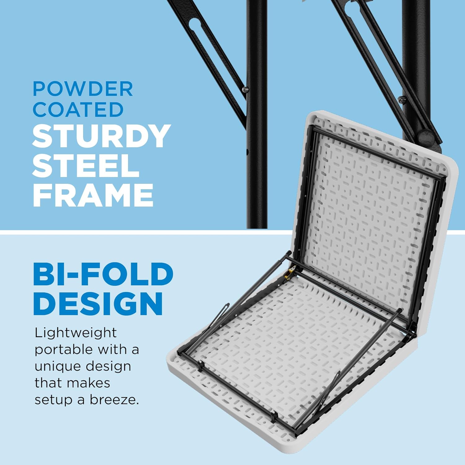 - HEAVY DUTY STURDY & STABLE - Lightweight and portable, this plastic folding table features an impact-resistant resin surface, waterproof & easy to wipe clean, and is supported by a heavy duty steel framework. The reliable anti-arch lock keeps it steady and stable on any indoor or outdoor surface.