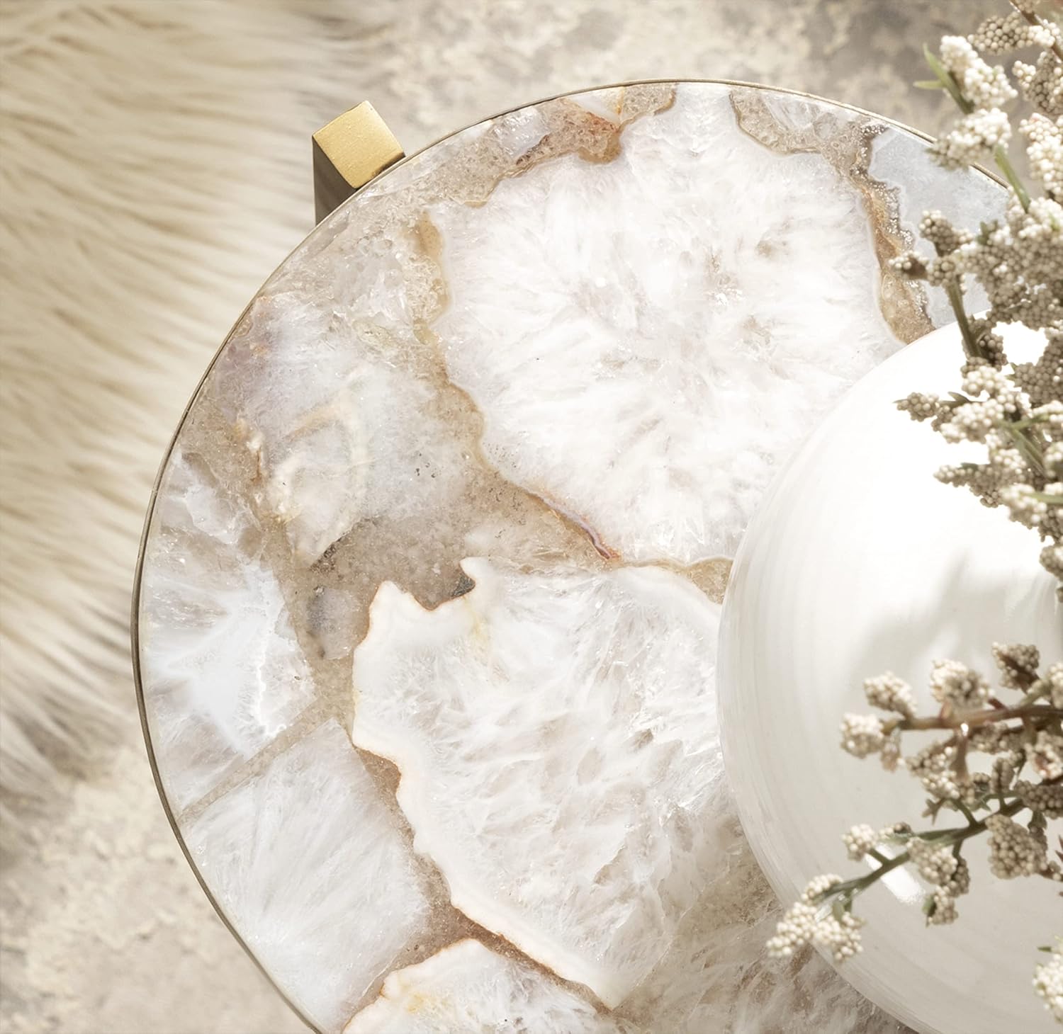 - Precious Stone: The Aguilar drink table is crafted in India with a precious quartz tabletop and an iron frame, the stone featuring unique veining that is distinct from piece to piece