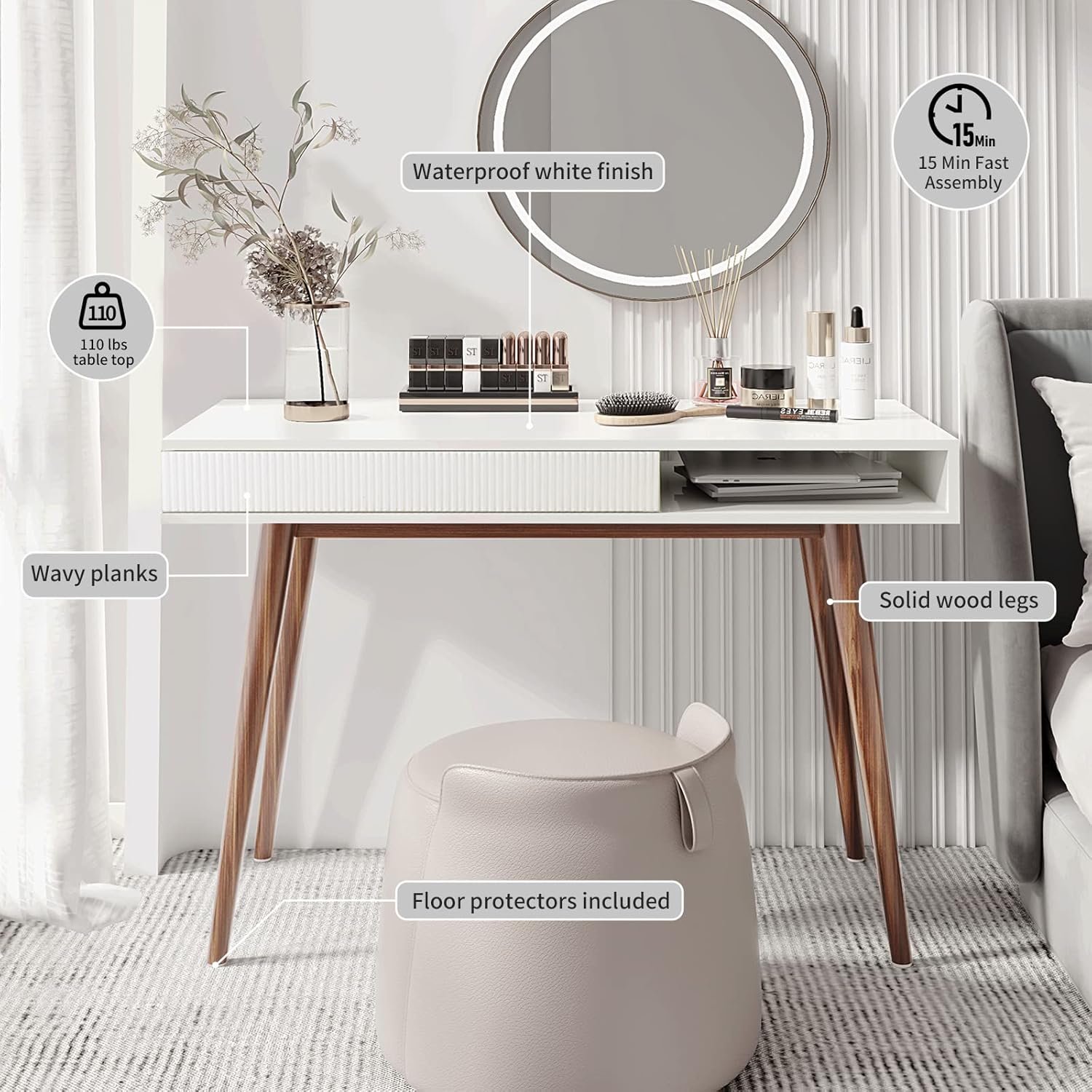 - ✅【Wide Desktop Area and Large Storage Space 】Overall dimensions are 42.5x19.7x29.5inch, large desktop allows you to put more items. The white writing desk with a cable grommet, making your desktop perfectly organized. The writing desk has hidden drawers with wave-shaped panels and handleless drawers, a stylish design, and a large storage space.