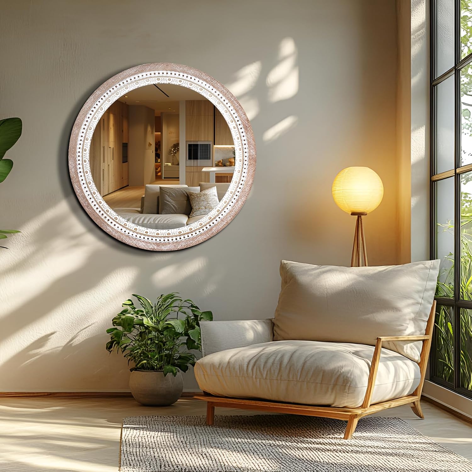 - Farmhouse Boho Design with Beads: This 24-inch wooden round mirror combines rustic farmhouse charm with bohemian elegance. The intricately beaded frame adds a unique texture that enhances any space, making it the perfect decorative mirror for your bedroom, living room, or bathroom