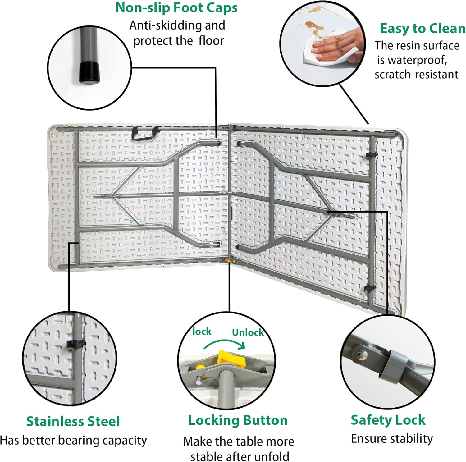 - 【Advanced Materials】The high-quality HDPE table top can bear 330 lbs,it is 20% thicker than other cheap 6 foot folding tables. the table top is waterproof and stain-proof, you can easily wipe it clean, the locking button and the rust-proof powder-coated steel frame greatly improve the stability
