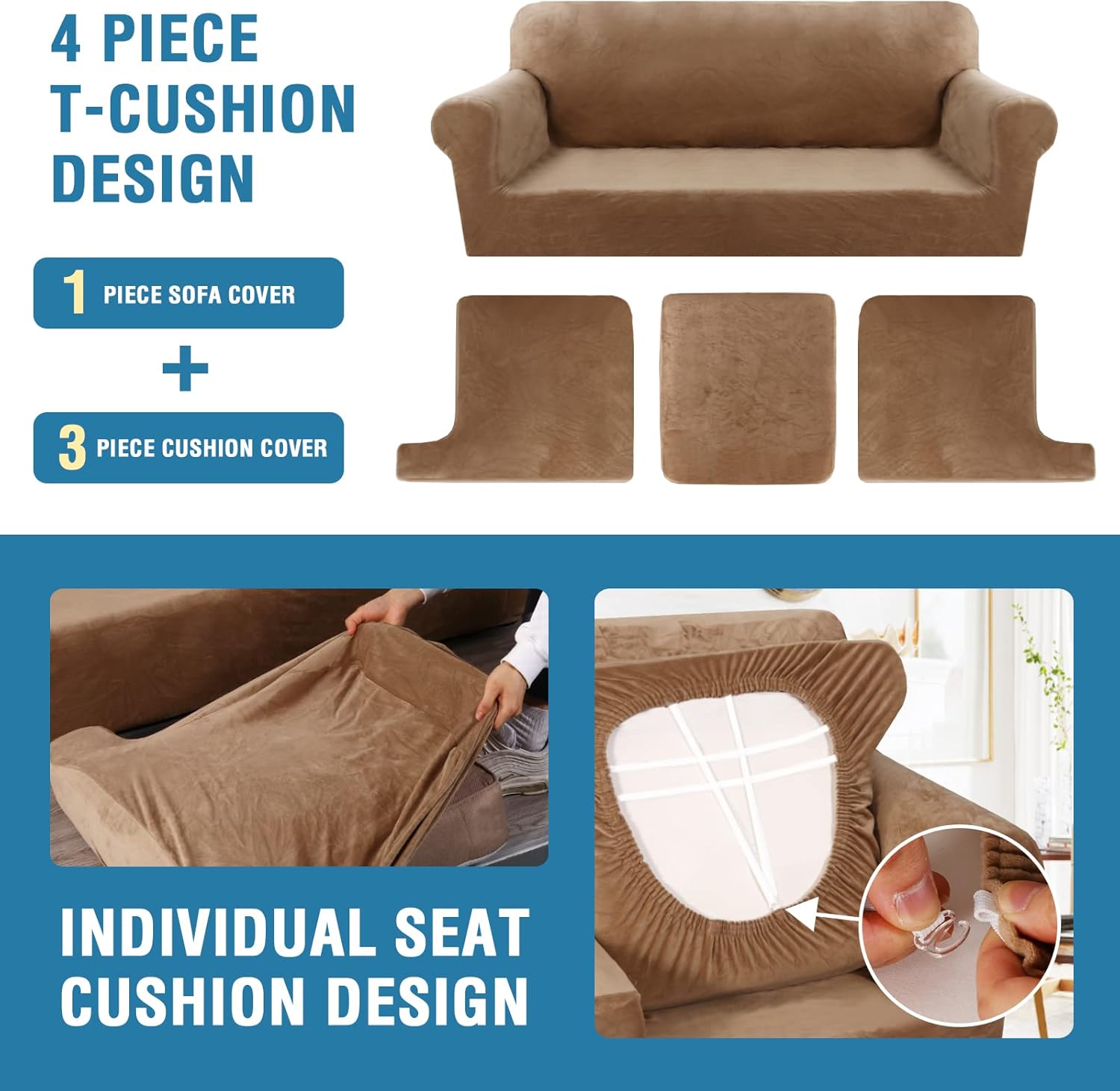 Sofa Cover 4 Piece T Cushion Sofa Slipcovers Thick Velvet Couch Cover Furniture Protector Stretch Sofa Covers for 3 Cushion Couch with 3 Individual T Cushion Covers Washable, Camel