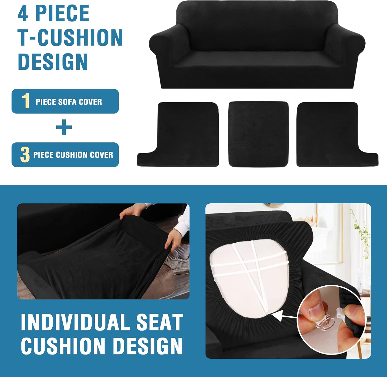 H.VERSAILTEX Sofa Cover 4 Piece T Cushion Sofa Slipcovers Velvet Couch Cover Furniture Protector Stretch T Cushion Sofa Covers for 3 Cushion Couch with 3 Individual T Cushion Covers Washable, Black
