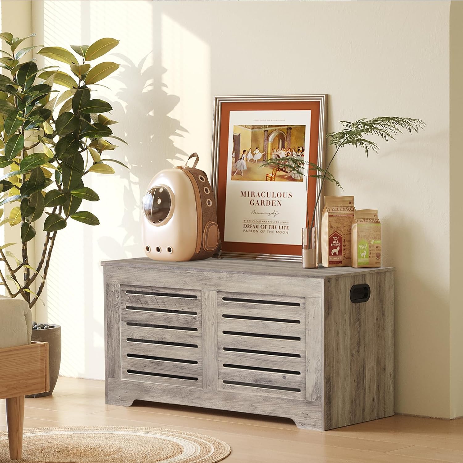 DINZI LVJ Storage Chest, Wooden Toy Box Organizer with 2 Safety Hinges, Flip-top Entryway Shoe Bench, Good Ventilation, Retro Storage Bench for Living Room, Bedroom, Easy Assembly, Greige