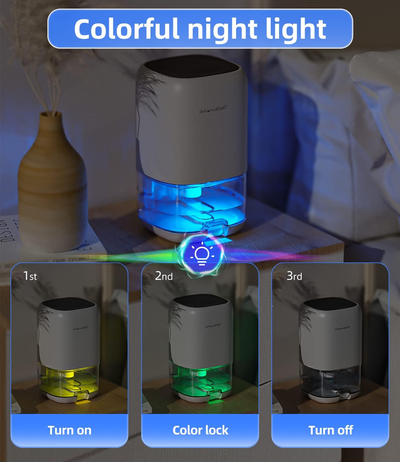 - Small Dehumidifiers with Colorful Light: There is a separate light button, which can emit 7-color romantic atmosphere lights for you, and the ultra-quiet operation (28dB) creates a comfortable and peaceful environment for your bedroom and office.
