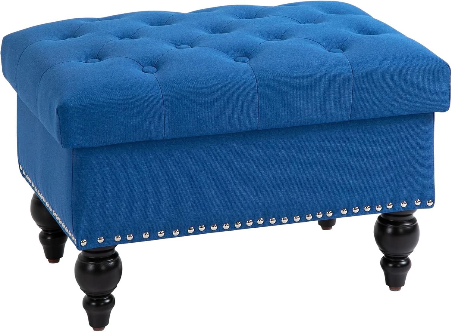 HOMCOM Ottoman with Storage for Living Room, 25" Storage Ottoman with Removable Lid, Button-Tufted Fabric Bench for Footrest and Seat with Wood Legs, Blue