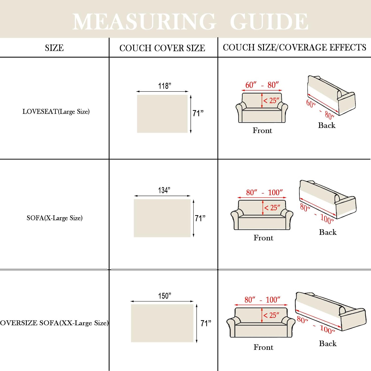 - ใ๐ฆ๐ถ๐๐ฒใProvide perfect coverage for the sofa (including armrests). We provide 3 sizes: Large Size 71"x 118 " suitable for loveseat, X-Large Size 71" x 134" suitable for 3 seat sofa, XX-Large Size 71" x 150" suitable for oversize sofa. ๐ ๐จ๐ซ ๐-๐ฌ๐ก๐๐ฉ๐๐ ๐ฌ๐จ๐๐, ๐ฒ๐จ๐ฎ ๐ง๐๐๐ ๐ญ๐จ ๐๐ฎ๐ฒ ๐๐ฉ๐ฉ๐ซ๐จ๐ฉ๐ซ๐ข๐๐ญ๐ ๐ฌ๐ข๐ณ๐ ๐ฌ๐จ๐๐ ๐๐จ๐ฏ๐๐ซ ๐๐จ๐ซ ๐ญ๐ก๐ ๐ฌ๐๐๐ญ ๐๐ง๐ ๐ญ๐ก๐ ๐๐ก๐๐ข๐ฌ๐. Please refer to the measuring guide before purchasing.