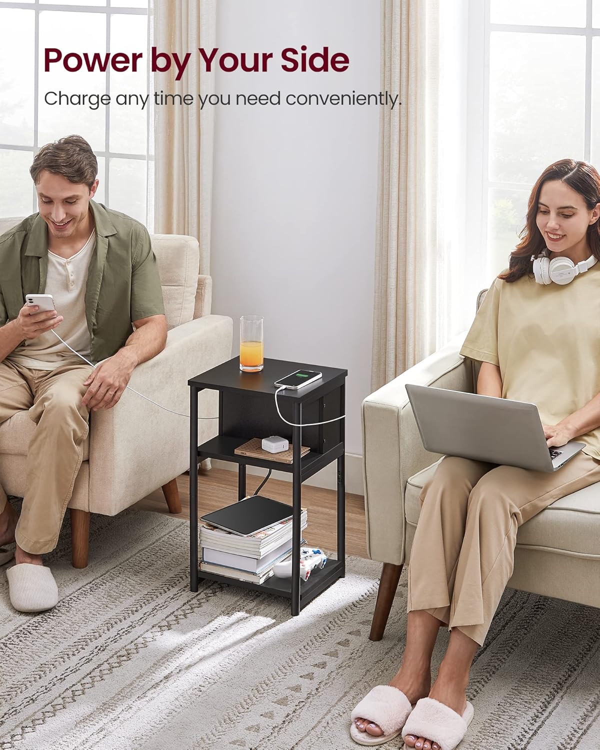 VASAGLE Side Table with Charging Station, 3-Tier End Table with USB Ports and Outlets, Nightstand for Living Room, Bedroom, 11.8 x 13.4 x 22.8 Inches, Plug-in Series, Black